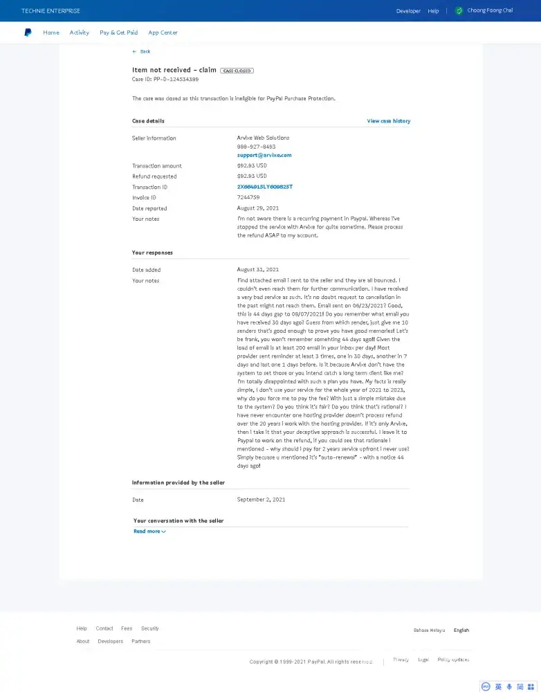 2. Hosting is an advanced payment service, at all time if a customer should be allowed to cancel unwanted service being charged. Instead Arvixe used a reason that the invoice has been sent and the service has been delivered as an excuse. Paypal also use the term "Item has been delivered" to close the case. Hence it made a consumer has to pay for a service that he/she does not required for 2 years from 7 Aug 2021 to 7 Aug 2023!