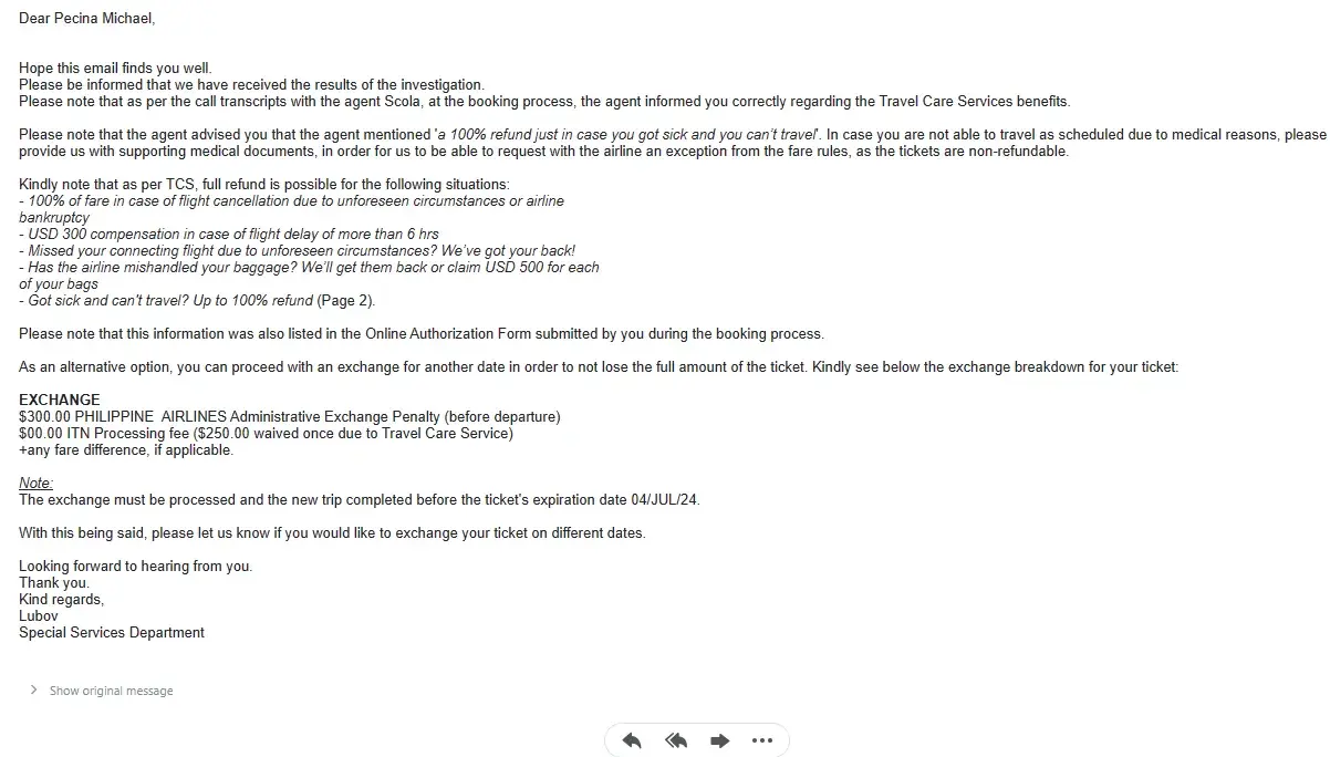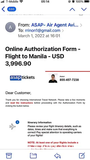 On 3/16/22, I called him and stated that we are retired on fixed income, looking for good deals with some travel comfort. After several offers, I told the offer for mixed economy is acceptable because the longer trip both ways will be on premium economy. Later he emailed me an Authorization Form-Flight to Manila-USD 3,348.00 (attached) and also suggested to include item 7-Travel Care Service for $339.90. I ask if he can send the details and his said “ can view the details by clicking the link below or by logging in to Customer Support using my last name and confirm. no. after authorizing the payment over the phone and ipad. As instructed trying to click the bottom link or logging in did not work.