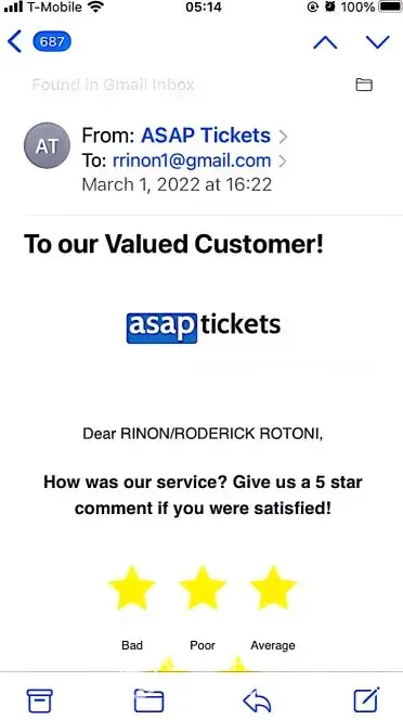 at that point I start searching reviews about ASAP TICKETS only to find out that I was probably one of many who got scammed by asap ticket