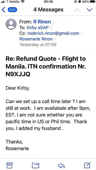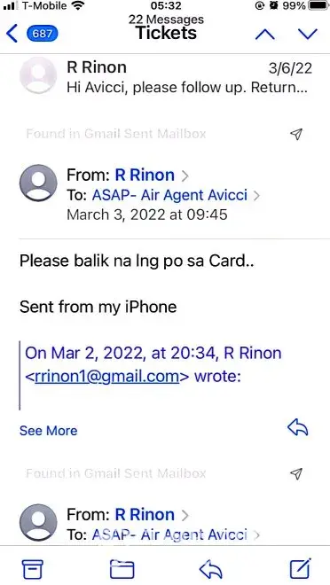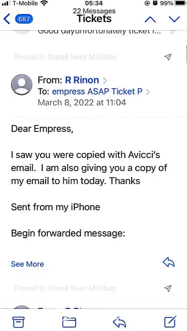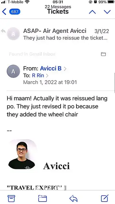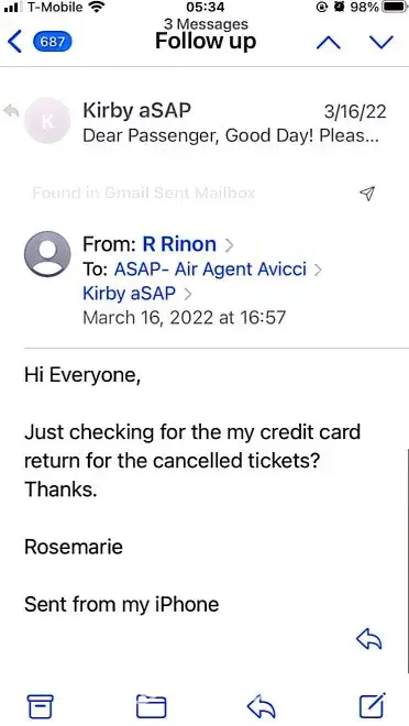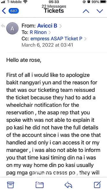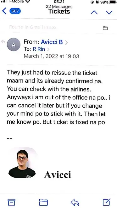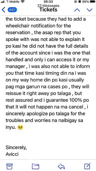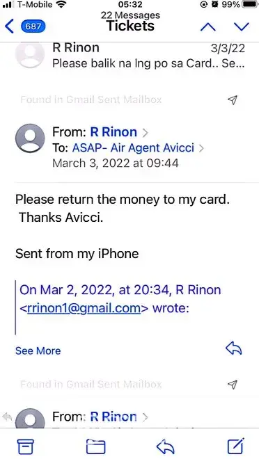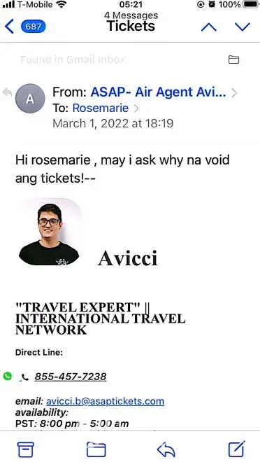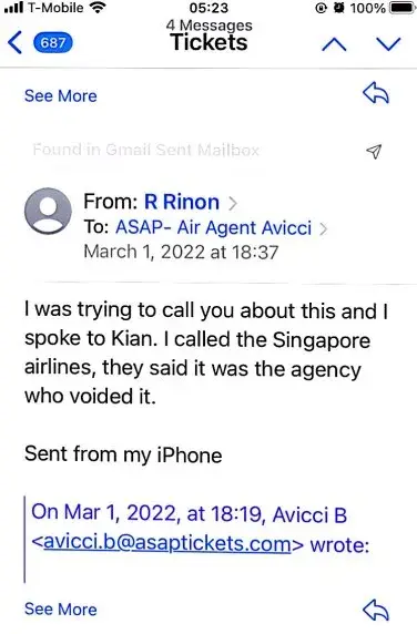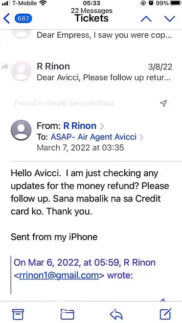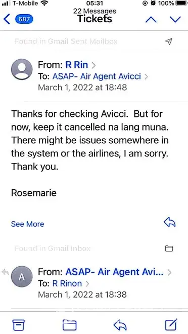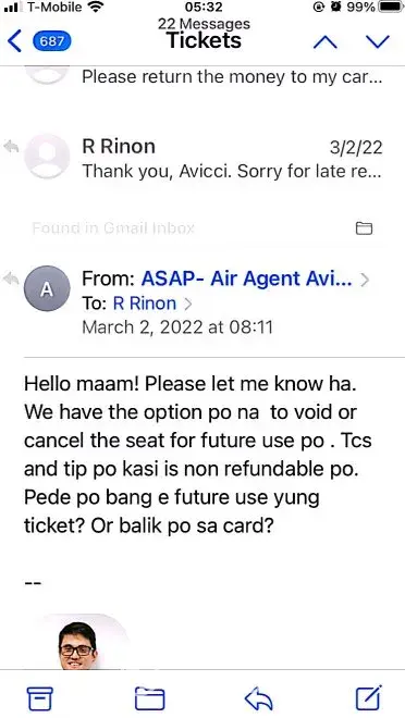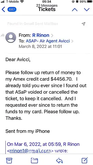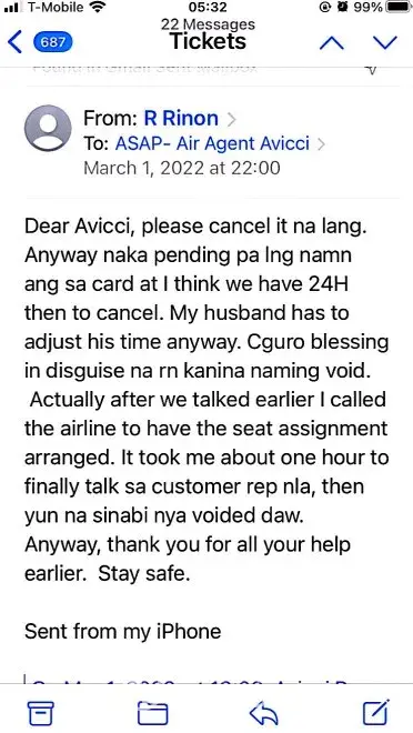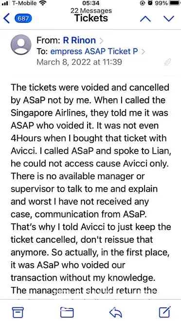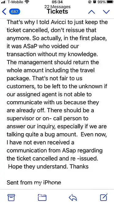 617-648pm email convos w/Avicci->told him it was ASAP who voided tkts per SA, consistently told him KEEP tkts CANCELLED; I do not want it anymore (i was scared of the inconsistency in ASAP and no one helped if agent Avicci was not around)
