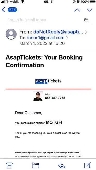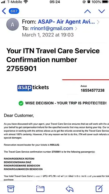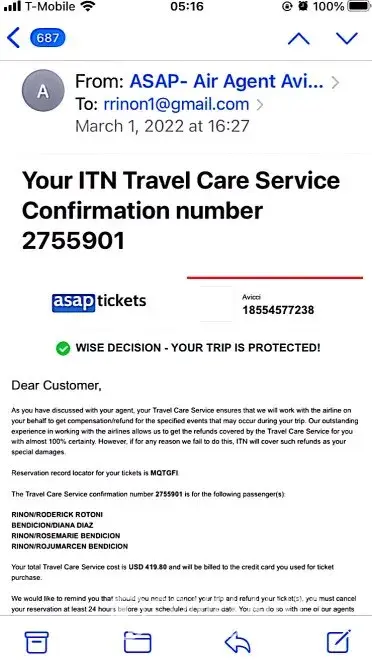 On 3/21/22 AsapTickets emailed Travel Care Services confirmation no. 2814505 (attached)