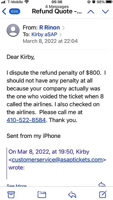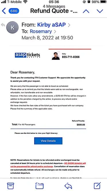 was searching for airlines tickets on the web when I was contacted by ASAP Tickets agent that was very kind and helpful and she offered to help me get tickets for a good price, she called me about 100 times a day and seemed like someone that's really trying to help. all that until I purchased the airlines tickets {not before I asked her about their policy} even at that point she was kind and emailed me a policy that clearly States that incase of illness I will receive 100% money back, with some bad luck the next day my mother and daughter also passengers on this purchase got diagnosed with covid.