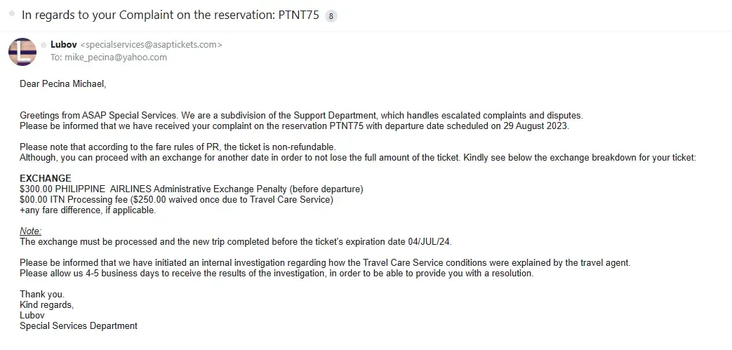When I started my search through ASAP Tickets, I was very specific about my requirements. I had clearly mentioned the date/time (18th June morning) and luggage (2 baggage per passenger for check in) which is important for me. I contacted Mr. Arnav (arnav. [protected]@asaptickets.com) on 21st Feb 2022 and he has confirmed that both requirements are meeting the criteria with airlines he suggested. I made the booking on 22nd Feb through Arnav. I had also paid extra protection (ITN Travel Care Services) $479.80 for this so that I would be covered with all the requirements that I was looking for.