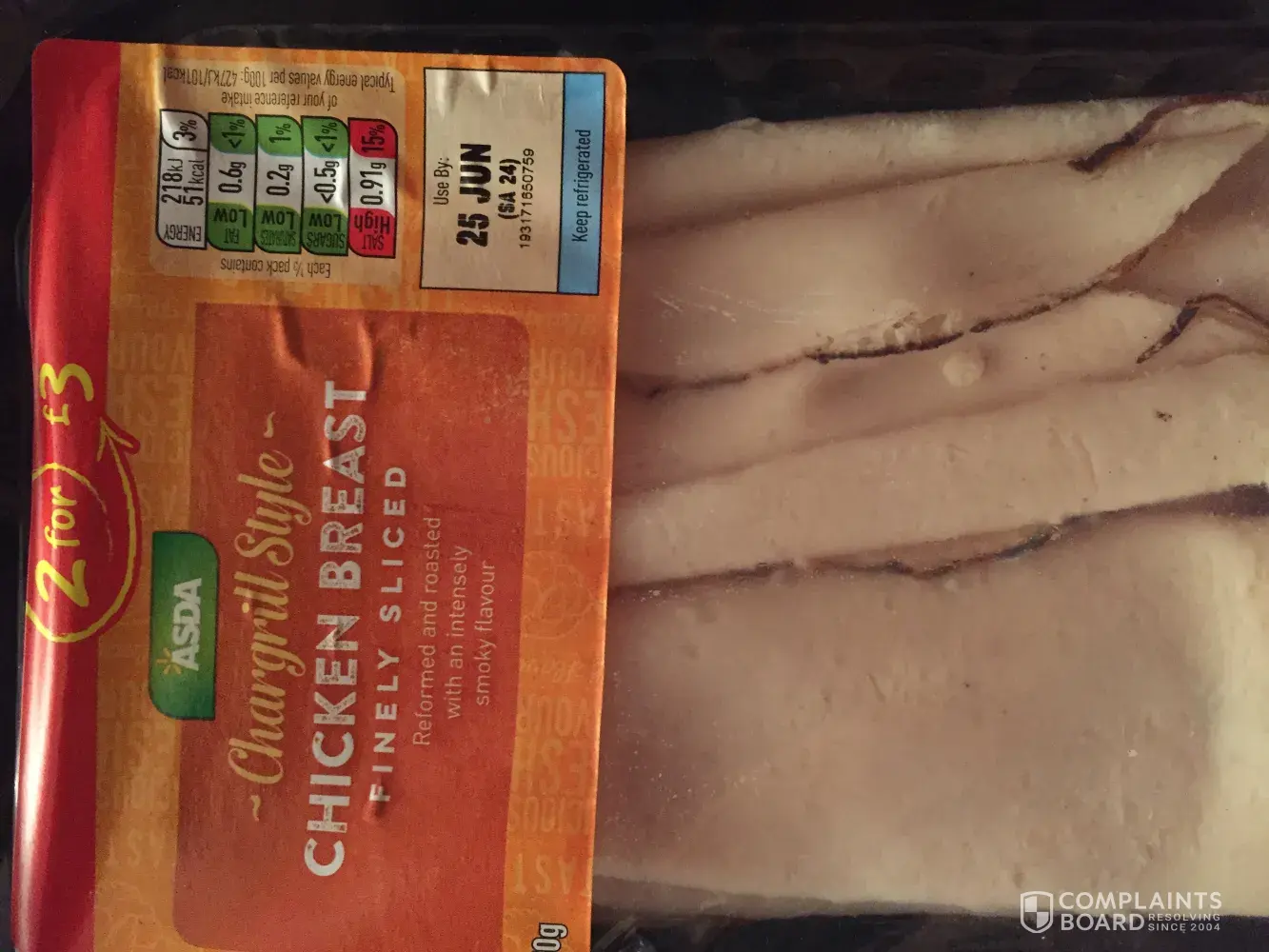 My asda thick sliced chicken which I ordered turned out to be chargrilled chicken and 2 weeks out of date 25th June 2017. My little girl could have opened this and it made her very ill.