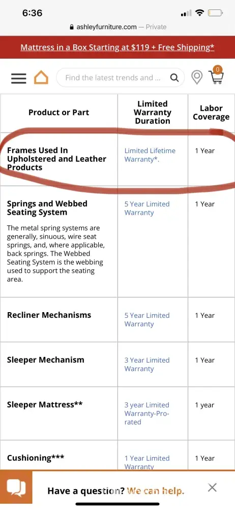 Bought a grey sectional in June 2020, was delivered a month later in July. Couch arrived in the color brown and with two holes. 5 months later, the curve of the couch won't even stand because the frame has fell. No either my wife or I weighs over 170 pounds, there is no animals, there is no jumping or rough housing on any furniture in my home. There's no reason as to why the sectional should already be broken. After a month of contacting Ashley (making the sectional 6 months old) they are refusing to honor the warranty. The warranty specifically states framework in upholster products is covered, not only that the salesmen said it was also covered.