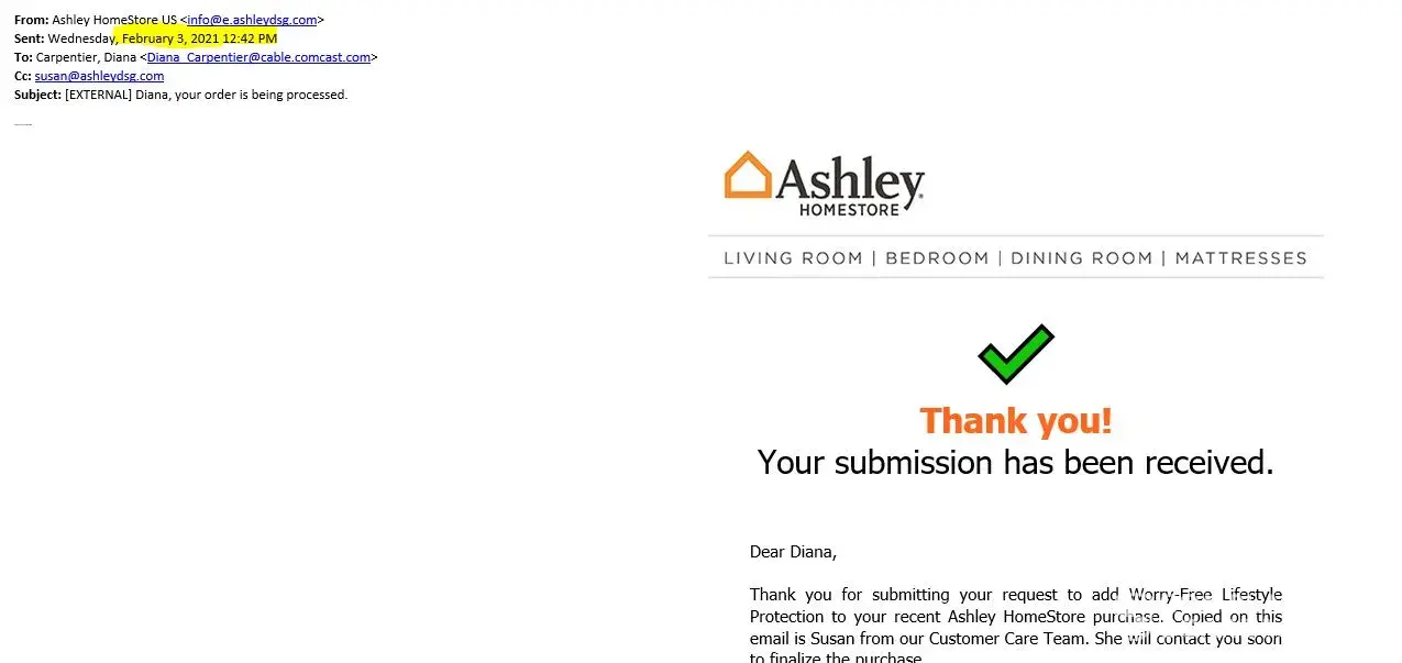 Ashley HomeStore Protection Plan-- not able to purchase before delivery date