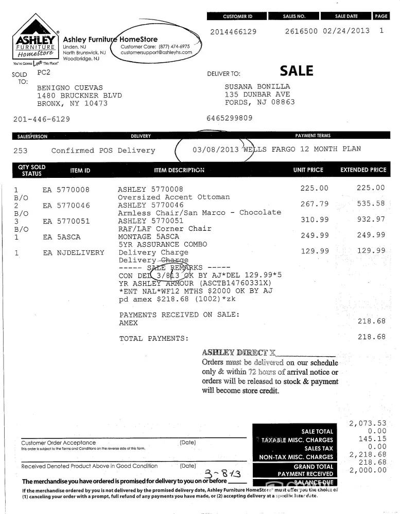 My family and I have been faithful customers of Ashley furniture for many years. On November 7, 2019, I purchase a sofa chaise for my daughter to be delivered. Her address was given. Since she lives in St. Louis I asked if I can pay for it and have it delivered from St. Louis to her home. The response was of course. The item and delivery fee was paid in...