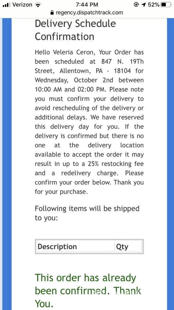 I had purchased a sofa with chaise and a whole bedroom set for my new house and it was set to get delivered on a Thursday after 5 weeks waiting and I called the store the night before to confirm and they had sent out a text to confirm online as well which I did and it somehow "got cancelled". Now, they're making me wait a whole other week from a mistake...