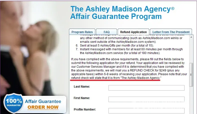 When I started to fill in their refund request form, I realize they aren't going to just issue a refund to my credit card. The only way to qualify for their refund is for them to send me an Ashley Madison check in the mail to my HOME address where my wife lives. I contacted them to ask for a refund back to my credit card instead and I got an absolute NO from them. What kind of a guarantee is that, where to get your money back you're guaranteed to get caught for cheating?