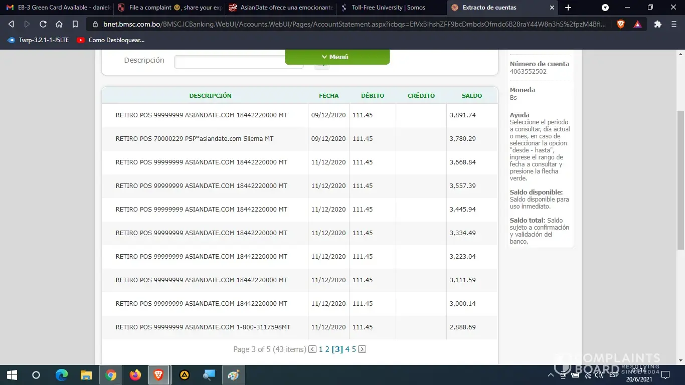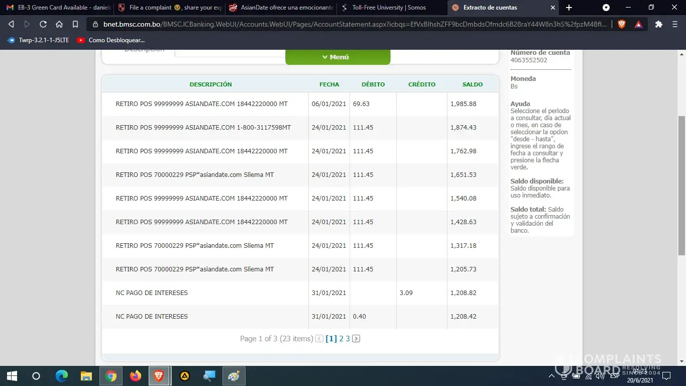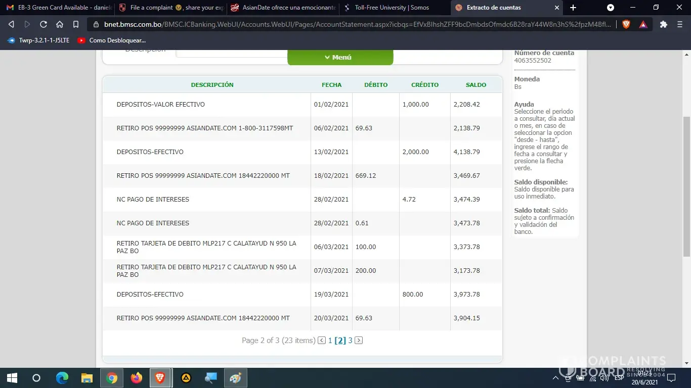 I paid with my debit card 20 $ us of my account in Dollars about 4 times, but I was stolen by Asiandate.com from my other account in national currency of Bolivianos (Bs.). They made me constant charges of 111.45 Bs. From my account in national currency equivalent to 16.2 $ us. on several occasions and they emptied my savings from October 2020 to April 2021.
