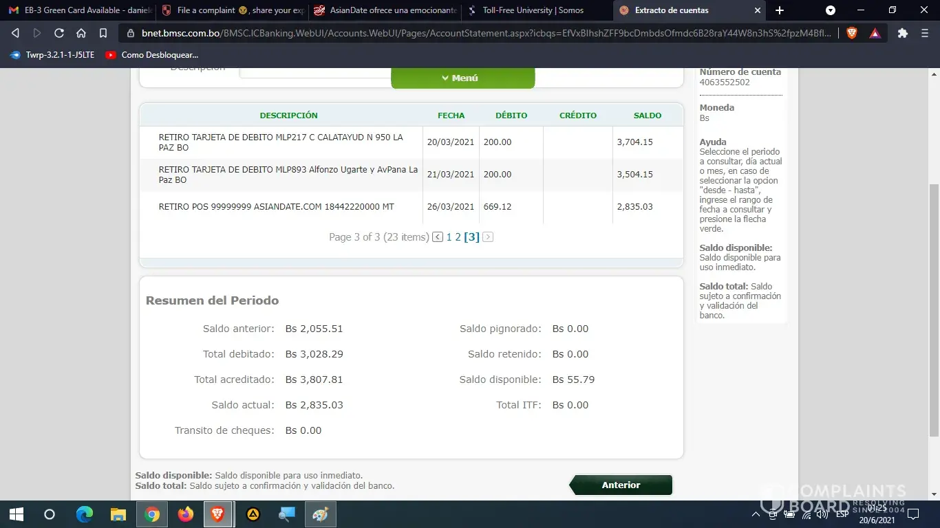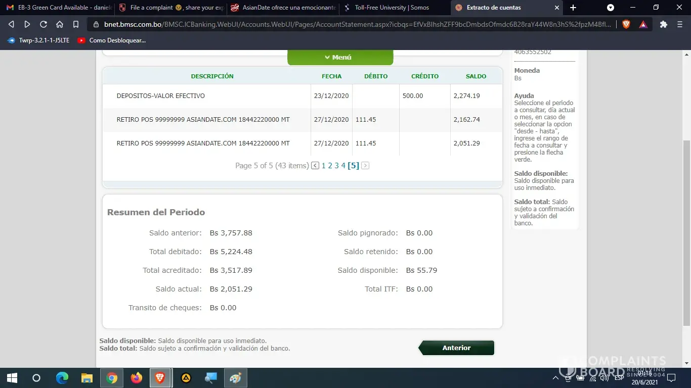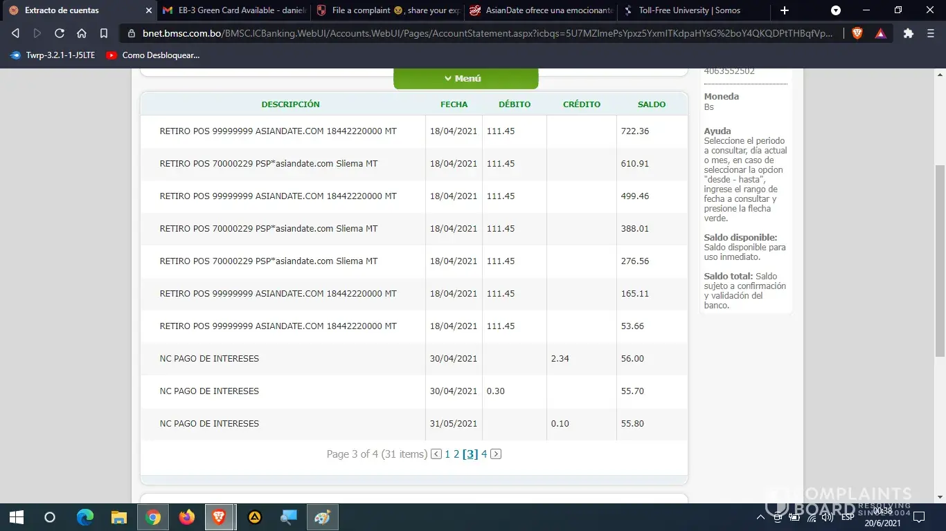 I paid with my debit card 20 $ us of my account in Dollars about 4 times, but I was stolen by Asiandate.com from my other account in national currency of Bolivianos (Bs.). They made me constant charges of 111.45 Bs. From my account in national currency equivalent to 16.2 $ us. on several occasions and they emptied my savings from October 2020 to April 2021.
