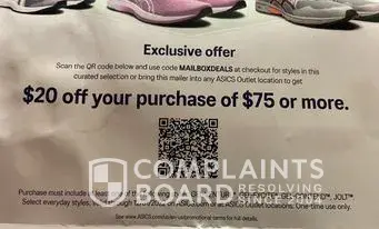 Received a mailer for $20 of $75. Purchased required items and still not given the discount. Spoke with customer service. Was lied to repeatedly. Was initially told there was no other supervisor available. Associate would not disconnect the call so I could give her a poor review - Her name was Aggregy.