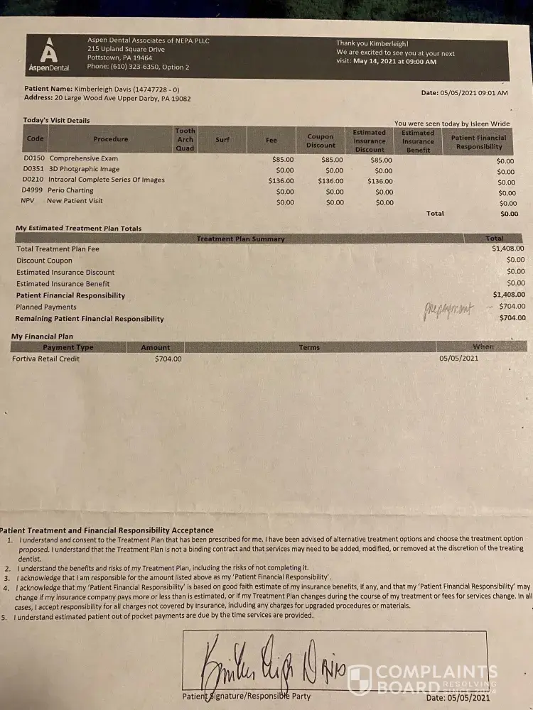 my wife was told that periodontal disease and would cost$1500.00. My wife said to me her mouth has been the same for the last 20 years or more. Aspen is a bunch of crooks. I went in for a cleaning and was told I needed implants which cost $5000.00 to $600000 each and I needed two implants. Also that I had two cavities. The next day I went to another Dentist and he said I did NOT have any cavities. Aspen are crooks and need to be CLOSED ! I had x-rays taken by Aspen, they did not show any cavities. I now have a copy of the x-rays in my procession.