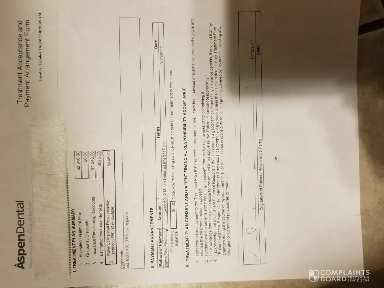 In October of 2017 I went into a aspen dental office to have multiple fillings refilled, a tooth pulled and some hygiene/cleaning. Before I had any work done I signed a treatment acceptance payment arrangement. The amount of all the work totalled $2316.00. But I have insurance and the insurance I have participates with aspen so I got a discount of $1042.00 and my insurance paid $825.00. So in total I was responsible for $448.80 and that included my deductible. So I accepted this treatment and instead of being out almost 450.00 upfront I did a 12 month no interest finance thing with dental first financing. Well I get my work done little by little and finally finish the end of October into November. Well my the beginning of December I had a broken filling. So I go into office have it looked at and was told no charge because the filling that failed was one I just had done. So everything's fine for next couple weeks until January I began receiving bills from them for $800+. After first bill I went into office to talk with the billing. They tell me that it was due to there upstairs people not taking off the discount and they would take care of it. Next in january I received another bill for same amout. I called In to office talked to someone else and they tell me same thing. February comes and I get a final notice bill. Stating that I owed $800+ for services and stating if I didn't pay it would go to collection. I again paid and became very mad and who I spoke with this time actually did something and I thought it was done. But then March comes and I get a collection notice in mail for not $800.00 but $125.00. I don't know how it goes from 800.00 to 125.00 but I called In and talked to a very rude man that attempted to argue with me that when I went in on December I didn't pay my bill that I signed saying I owed $86.00 for hygiene. I had to argue with him that the dentist told me no charge for fixed filling. And after he read further on the paper he saw he was wrong and told me it would be taken care of and hung up on me. Now it's April and I got a second collection notice. There are some incompitant people working at the butler Pennsylvania office. What's sad is the dentist and his hygentist and assistance are wonderful but this experience has made me so jaded that I won't go back to this office. Buyer beware. As of today 4/24/18 I am still dealing with this issue.