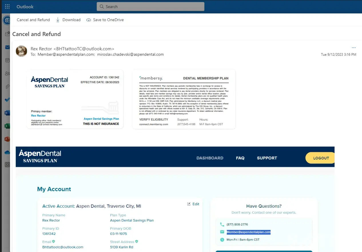 Called again 9/12/2023 and spoke to a man who gave us his email address: miroslav.[protected]@aspendental.com. He again told us our accounts did not exist. We sent him a screen-shot of our accounts as we were able to see all of the account information. He said we would receive a call in 2-3 days..we did not receive that call. 9/12/2023 emailed a written request to cancel and refund.