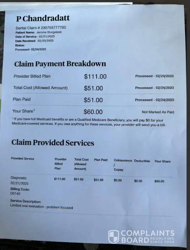 On feb 21 I was charged $111 for a dental evaluation I submitted the claim to my medicare supplemental and they paid $51 i, ve been trying for several months to get a refund but I just get put off, I had procedure done in n apple valley mn and was referred to the hastings office for collection the number ive been in communication with is [protected].