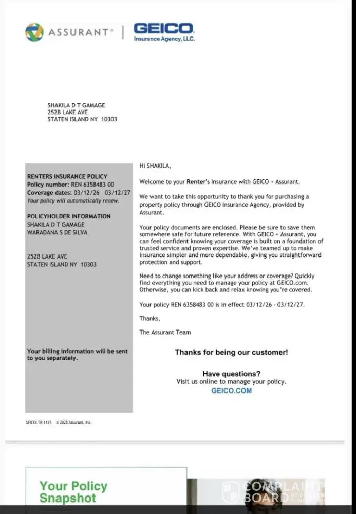 Subject: Complaint Regarding Renters Insurance Policy Visibility and Account Access 03/18/2026 To Whom It May Concern, I am writing to formally raise a complaint regarding my renters insurance policy purchased through GEICO and underwritten by Assurant. I purchased a renters insurance policy on March 12, 2026, and my bank account was charged $29 for the...
