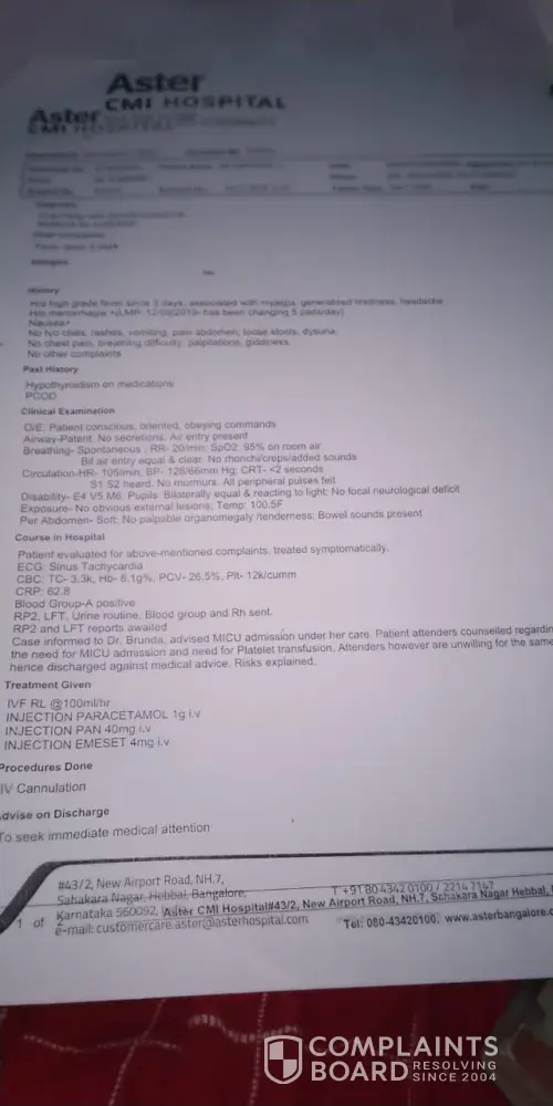 Hi, This is regarding a patient Kirthana V who was admitted to the emergency ward in Aster Hospital in the above mentioned address on the 16th Of November, 2019. She was dragonized with dengue and due to heavy menstrual flow her hemoglobin was low. Also the platlet count was low however as per the blood report that we received from Aster it was as low a...