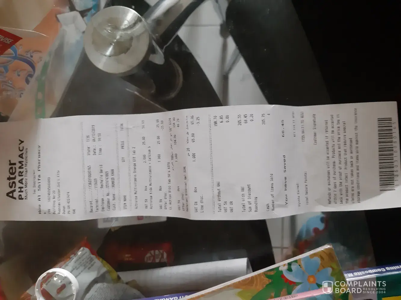 I just purchased a Country life_ vitamin B supplement from Aster pharmacy international city V - 20. The price on the bottle was 103 AED, but the bill generated 134. I took it but I realized about the difference so again went to the pharmacy and asked about it and she said it's a mistake...how can a mistake of 31 AED be acceptable. She changed my bottle with another bottle with the new price that is 134 and gave it to me. Since I was getting late I left . But I feel this is very wrong. Kindly look into this and I expect a re reimburse of the 31 AED.