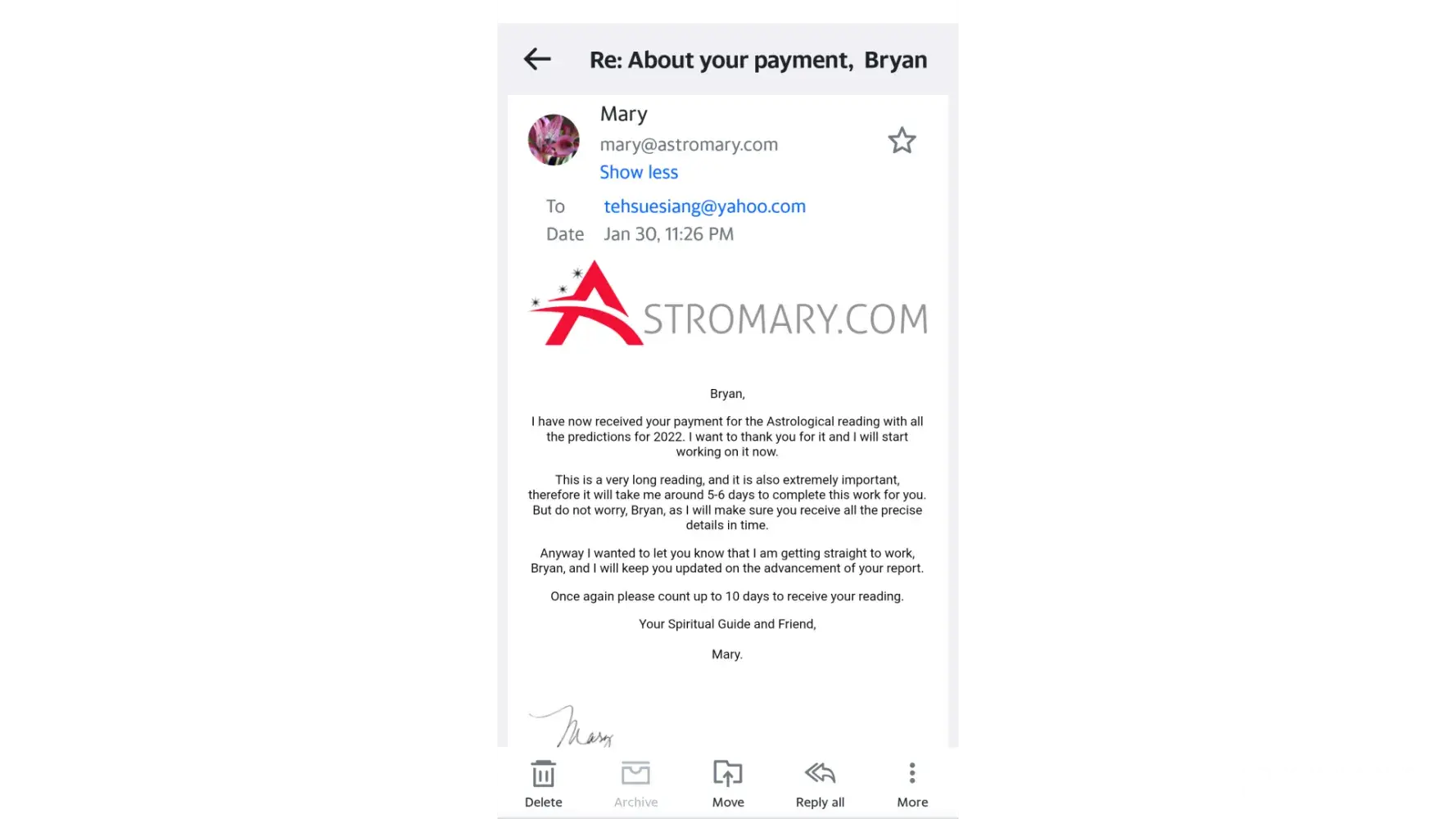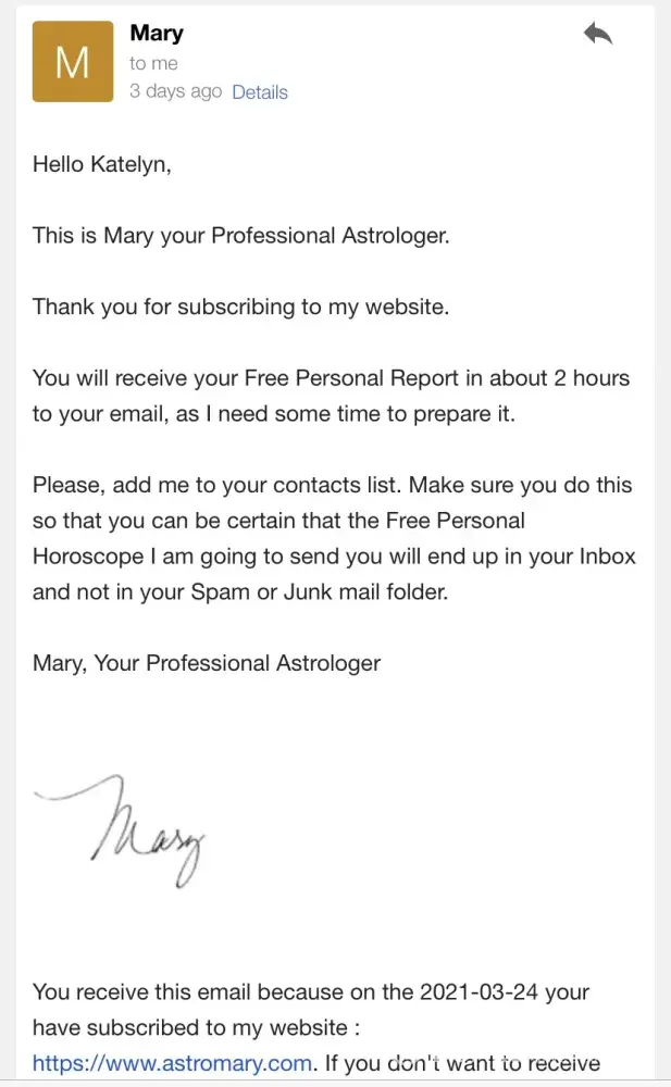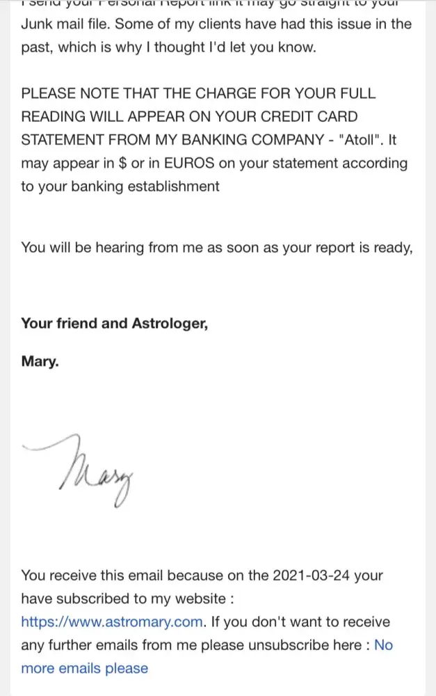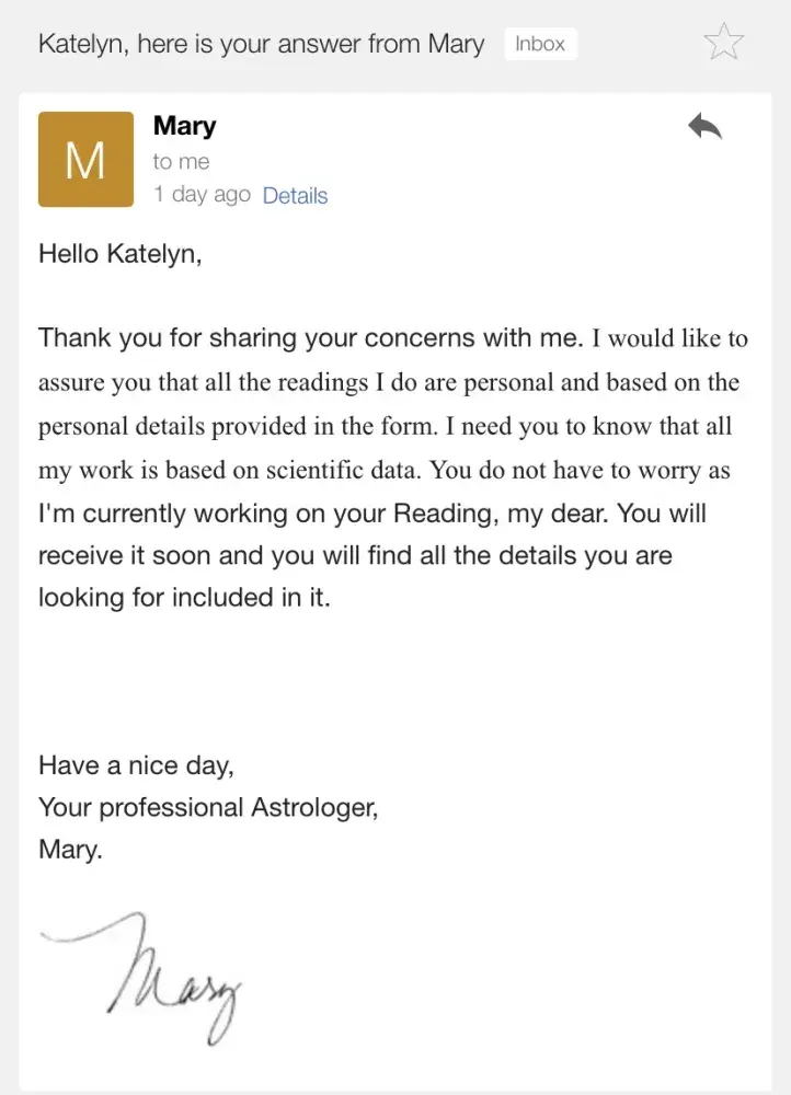 I received many emails from Astromary for astrological readings. Ultimately, I agreed and