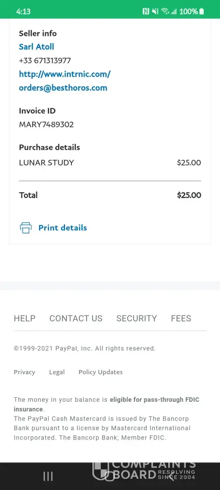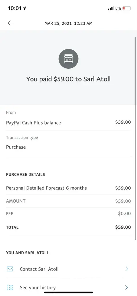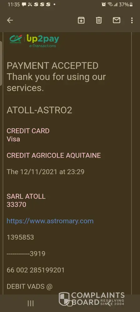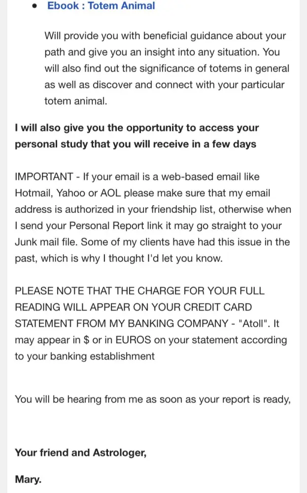 AstroMary.com Paid $59 to Paypal “Sarl Atoll” for reading I never received