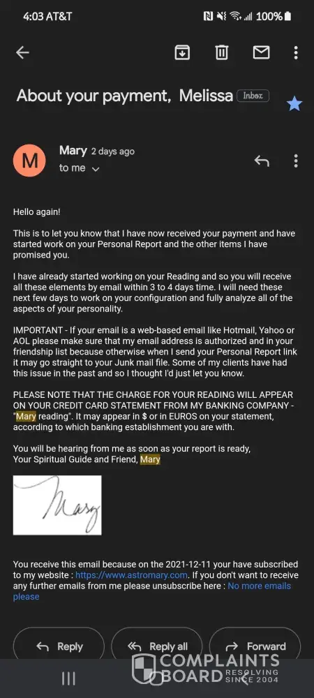 I note that all these complaints are from 2/3 years ago and I see some were resolved but it does not say how resolved. Is Astromary a fraud? I've been in contact with 'her' and got free reading and was wondering about paying the 59 euros for full reading when decided to check and saw your page here