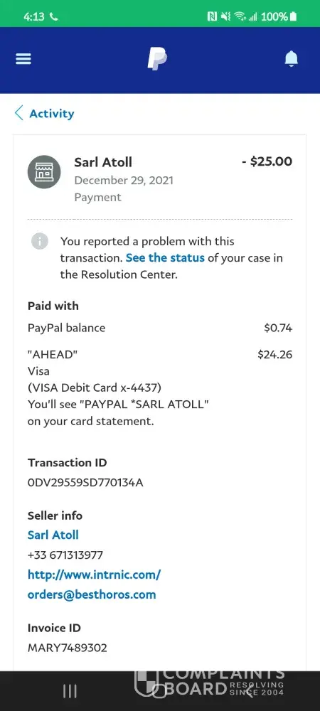 I just filed a complaint but wanted to add an additional photo of a paypal complaint from a mother who's daughter got scammed in a similar way to me, involving astrology as well about an astrologer "Jenna" whos paypal is also sarl atoll, the same paypal "Mary" was using for the website I mentioned in my last complaint. The same individual has several different fake websites under several different fake names. One being Jenna, and one being Mary, probably more. Please beware and don't purchase or associate with astromary.com