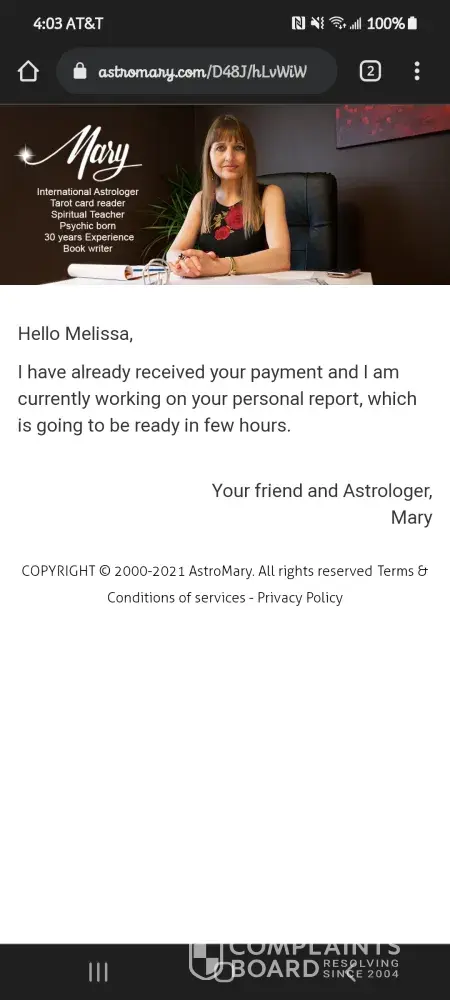 Our conclusion: After careful review, ComplaintsBoard concludes that AstroMary.com has trust issues, raising doubts about their legitimacy. We highly recommend being cautious and doing some research before engaging with AstroMary.com. If you have had a negative experience with AstroMary.com, let ComplaintsBoard know by filing a complaint.