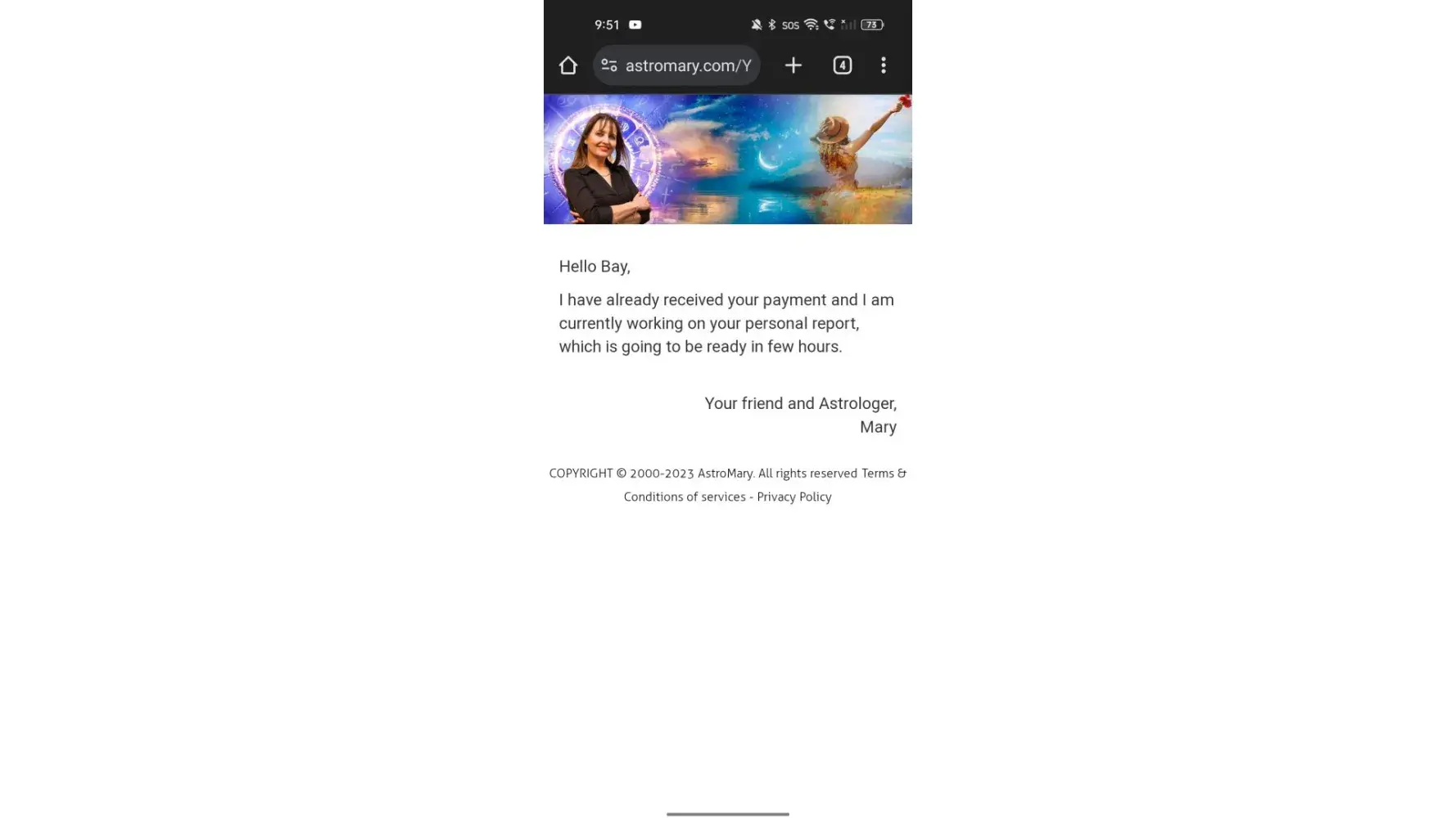 I saw astromary while browsing on the internet. I started receiving regular emails for a personalized reading for 6 months or so after I make a payment of 19$ which is around 1550 INR. I made the payment and i sent the confirmation along with the screenshot to the email ids provided. But since then I am waiting to hear from her with the service i paid for. All I'm receiving is the payment followup emails (when i have already made the payment). Please help me get the sorted asap.