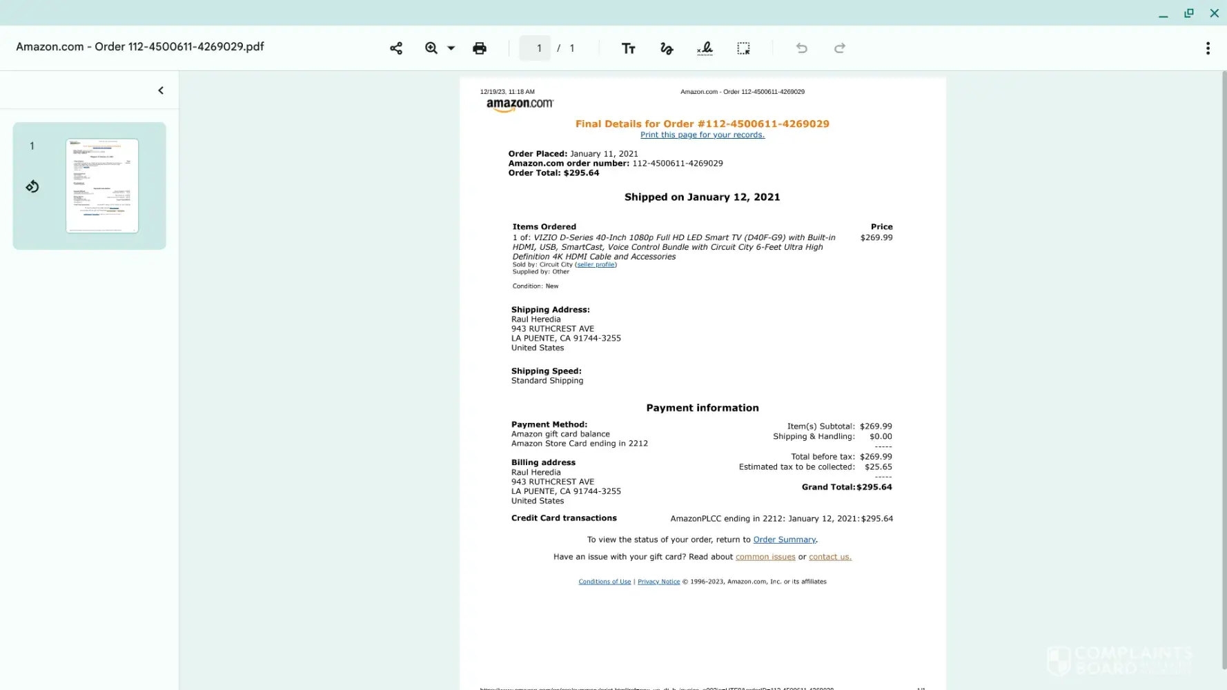 Claimed loss: $295.64