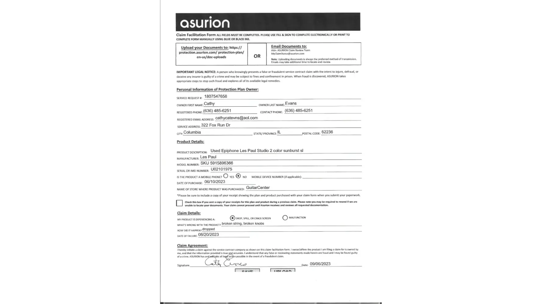 I purchased the item along with warranty on 6/10/23, filed for repair on 9/6/23 and was denied. Claimed my info. was not matching. the reason not matching is my son who is using his guitar is currently staying with someone on temp basis and gave their email address. my email address is on the claim form which is correct. Purchased at the Fairview Heights IL Guitar Center, Sls number [protected], on 6/10/23, my son is on a temporary location two hours from our home in Carmi IL and is having the guitar fixed at Guitar Center in Evansville Indiana, and the individual gave the email address of where he is staying at. On the claim form I submitted as his mother, I gave all of our pertinent information which is true and correct including my email address, not the email address of where he is on a temporary basis. I had called the Guitar Center in Evansville and was assured he could get it repaired there because of the warranty and it didn't make a difference.