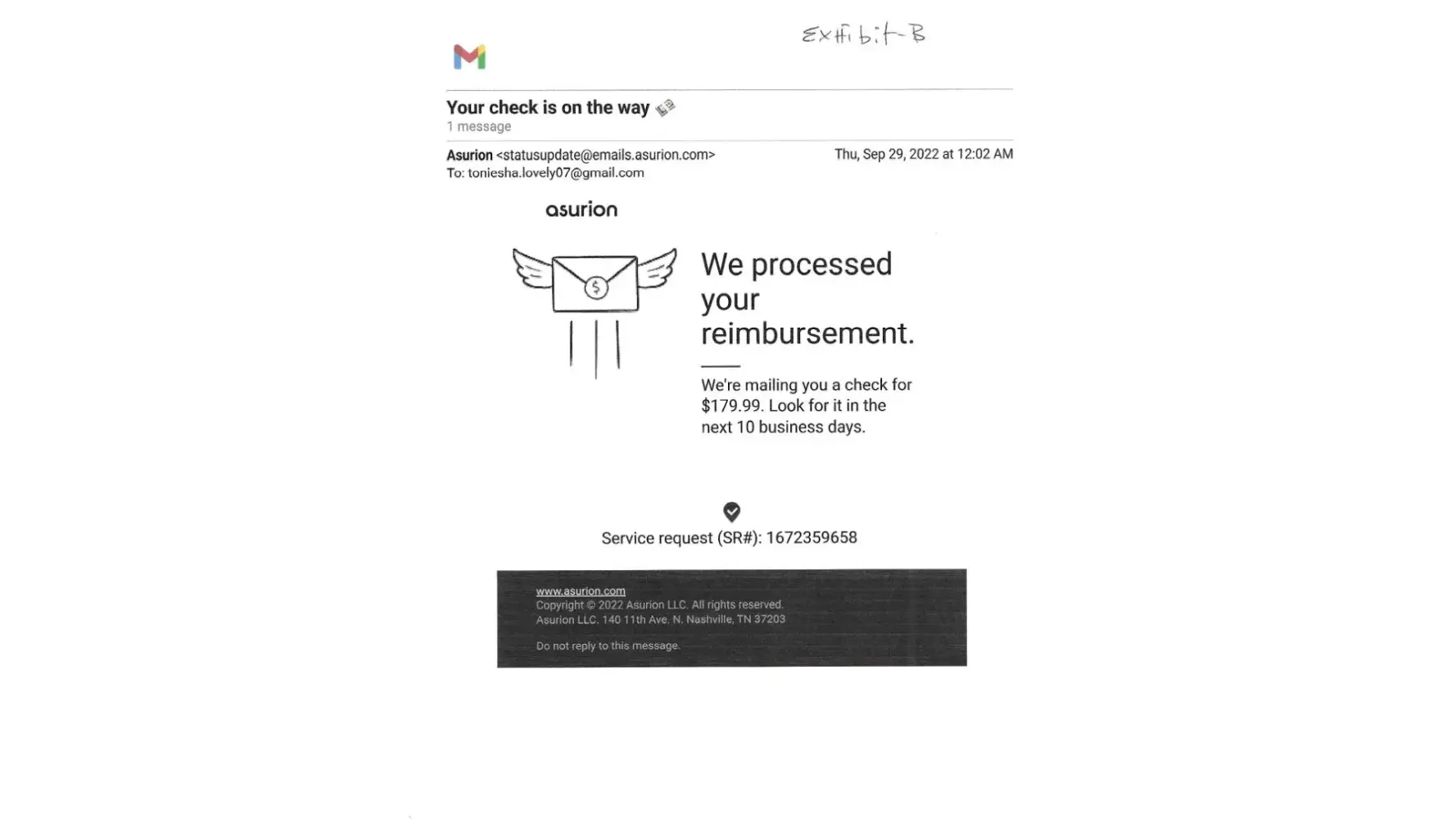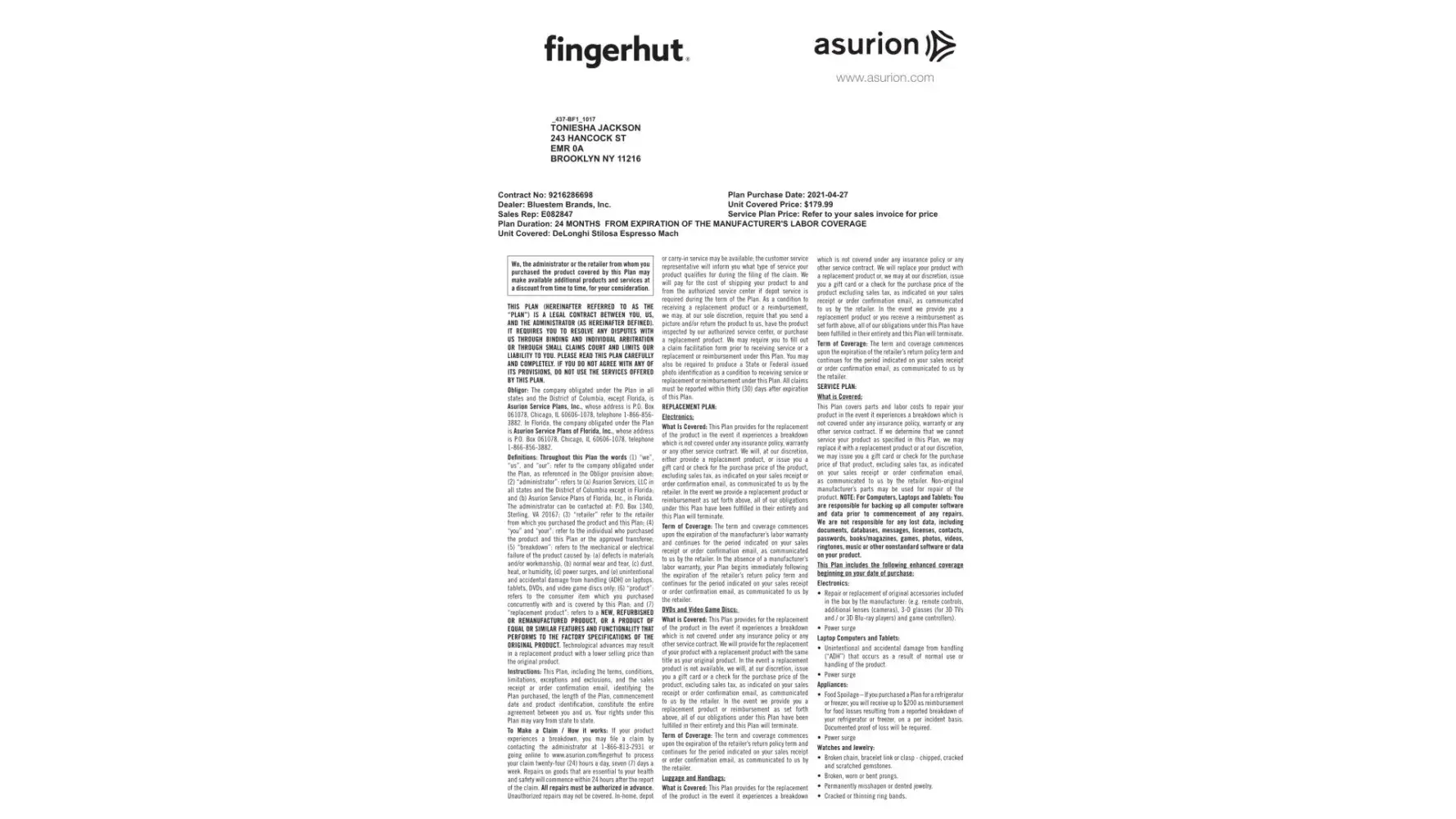 After I returned a broken DeLonghi espresso coffee machine pursuant to my Asurion protection plan I never received my refund for $179.99. After Asurion received the broken DeLonghi expresso coffee machine from me through a UPS return from me I was then sent two emails from Asurion one on Tuesday, September 6th, 2022 at 5:17 p.m. and a second email on Thursday, September 29th at 12:02 a.m. Asurion is lying to me regarding sending me a refund check for $179.99 that they were supposed to be having delivered to me because I never received the initial check or the second check promised to me. I spoke to an Asurion agent named Ms. Lady on October 6, 2022, who promised I would receive a refund in the mail for $179.99 no later than October the 12th, 2022 to no avail. I've enclosed 9 pages and one audio recording of documentary evidence regarding the consumer fraud towards me. The phone number that I called to inquire about my Asurion service request and refund is: [protected] and my service request number is (Sr#) [protected]. The Asurion Corporate Office Headquarters address is 648 Grassmere Park Nashville Tennessee 37211. The Asurion Headquarters Corporate Office phone number is [protected], [protected], or [protected]. Because Asurion refuses to fulfill their service agreement obligation by giving me my refund of $179.99 this is a breach of contract and I feel consumer fraud.