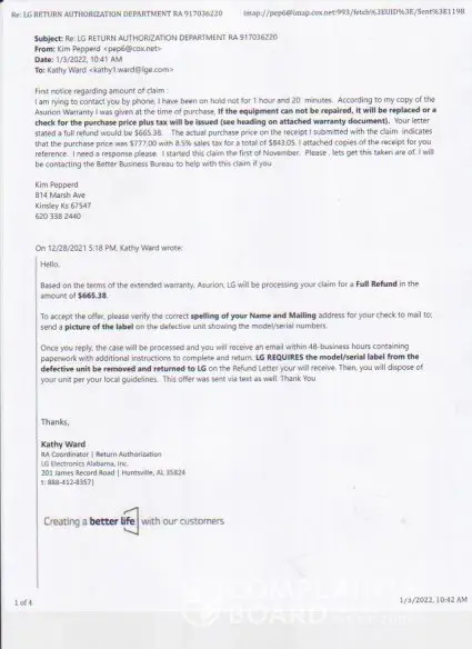 Attachments: Receipt for LG Washer and Warranty, Cope of Warranty stating refund policy and letter to Kath Ward, regarding refund offer.