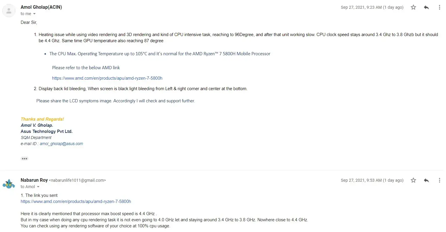-Screenshot 2 and Screenshot 3 : How asus technicians didn't even acknowledge CPU clock speed issue and GPU temp issue. This was the 4th time. The other 3 times asus did the diagnosis in service center and said the same on call without repairing my laptop. The official technicians didnt even asked me before declaring the laptop has no fault.