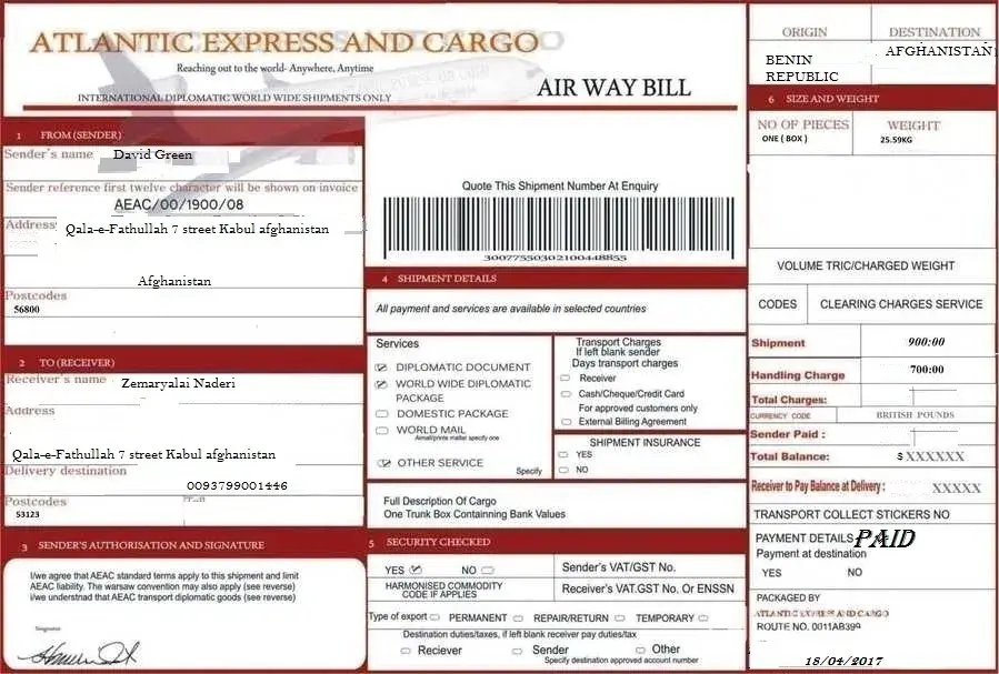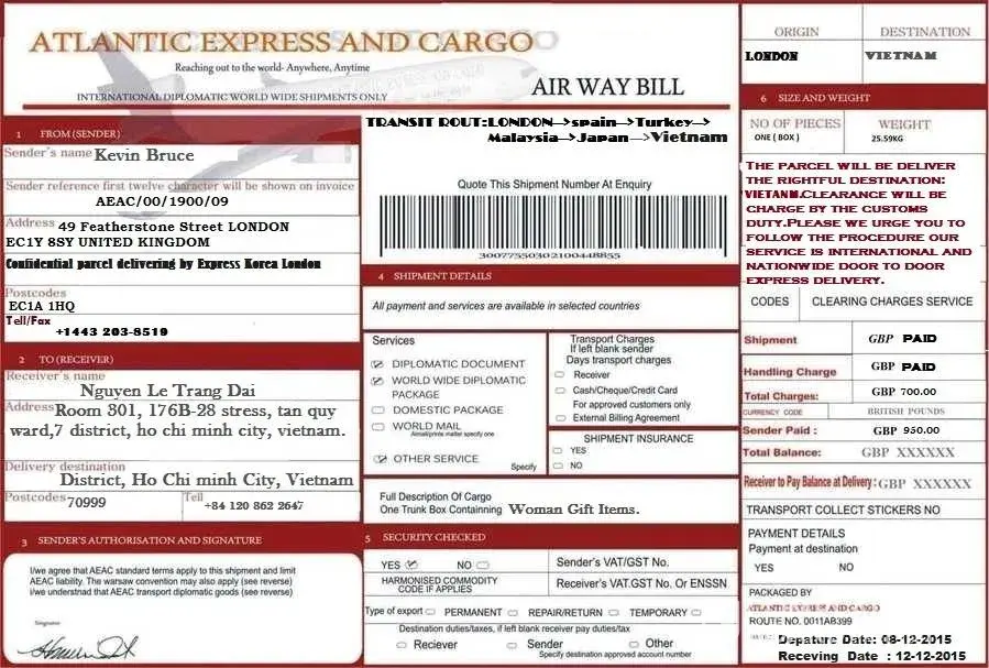 Honey...here is all the list and the airway bill of your gift, the company will make delivery to your address give me because i gave them your contact information and how to make delivery to you...so the company say you will pay the little local charges in your country like 450dollar or 500dollar that what them told me but them didn't told me how much you will pay that's why i put 8, 000britishpounds inside the package...make sure that you make the payment and let the company deliver your gift to you Immediate.remember the gift is too expensive i spend alot money for that gift plus money i put inside the package