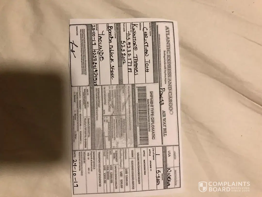 I just want to know, from Atlantic Express & Cargo why they are letting these people use their Company name, they should find out about these people and put them behind bars. It's gonna effect their services to all over the world. And the other thing is no one will trust them. Some body has to do something about it. Because I just have a box deliver too. But I have to pay $2, 100US I can't believe it, cause if I send a package I paid for everything so the receiver just pick it up when it's arrive or they just deliver it to the address on the package..