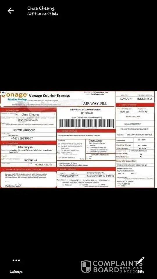 I got a parcel from the UK using a diplomatic international facilities world wide shipments only, with no invoice: AEAC/00/1900/08 shipment and quote this number at inquiry: [protected]. goods sent to my alamt Ismah harrusaty, Jl. No. Madura Strait. 3 Port of Tanjung Intan Cilacap Indonesia 53 123. This time the goods have arrived in Malaysia, and the courier who brought my package asked me to send money as much as 2500 ringgit malaysia for purposes that I do not know, I have sent money via western union. but then I ask the courier to send any more money on insurance costs for 4500 ringgit malaysia. whether or not such provisions apply to shipping my items. appropriate way the water bill I received, the sender is charged GPB.1.600. please explain and how the presence of my package. Thank you.