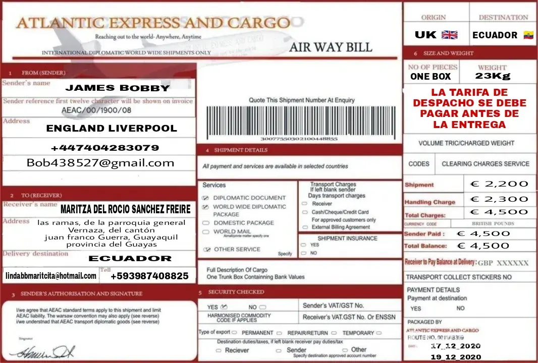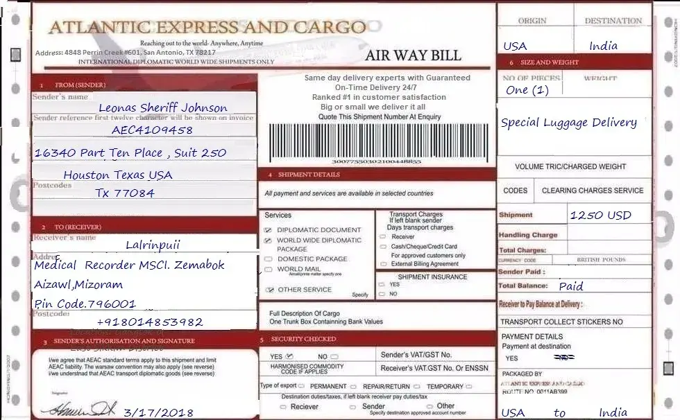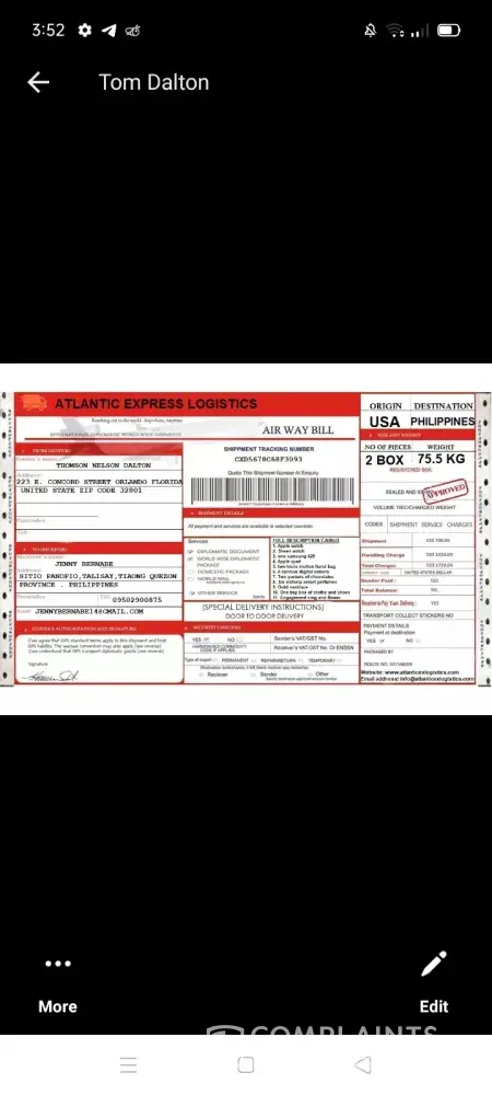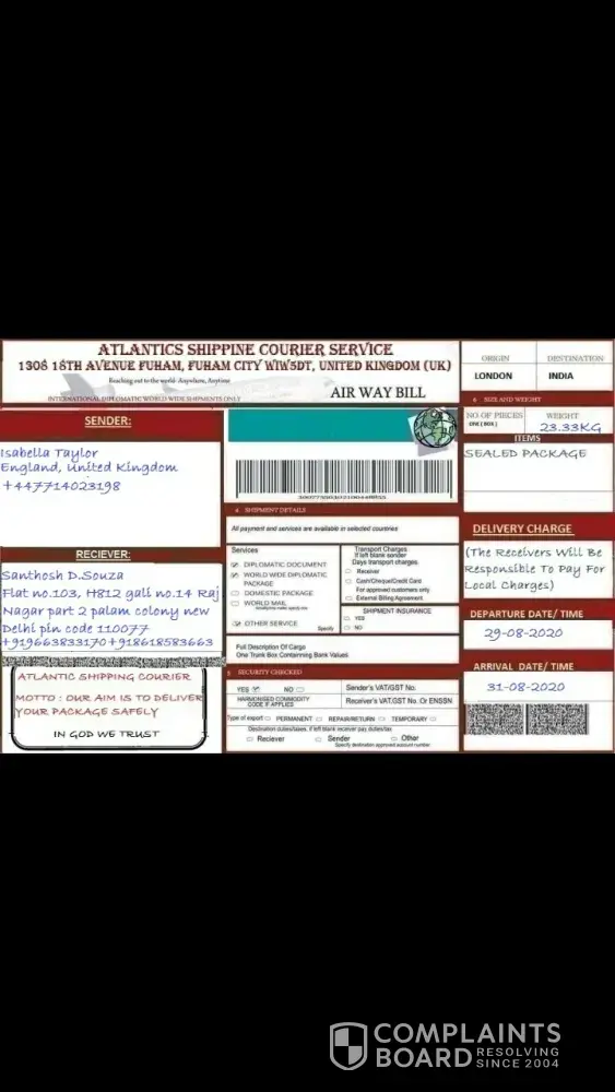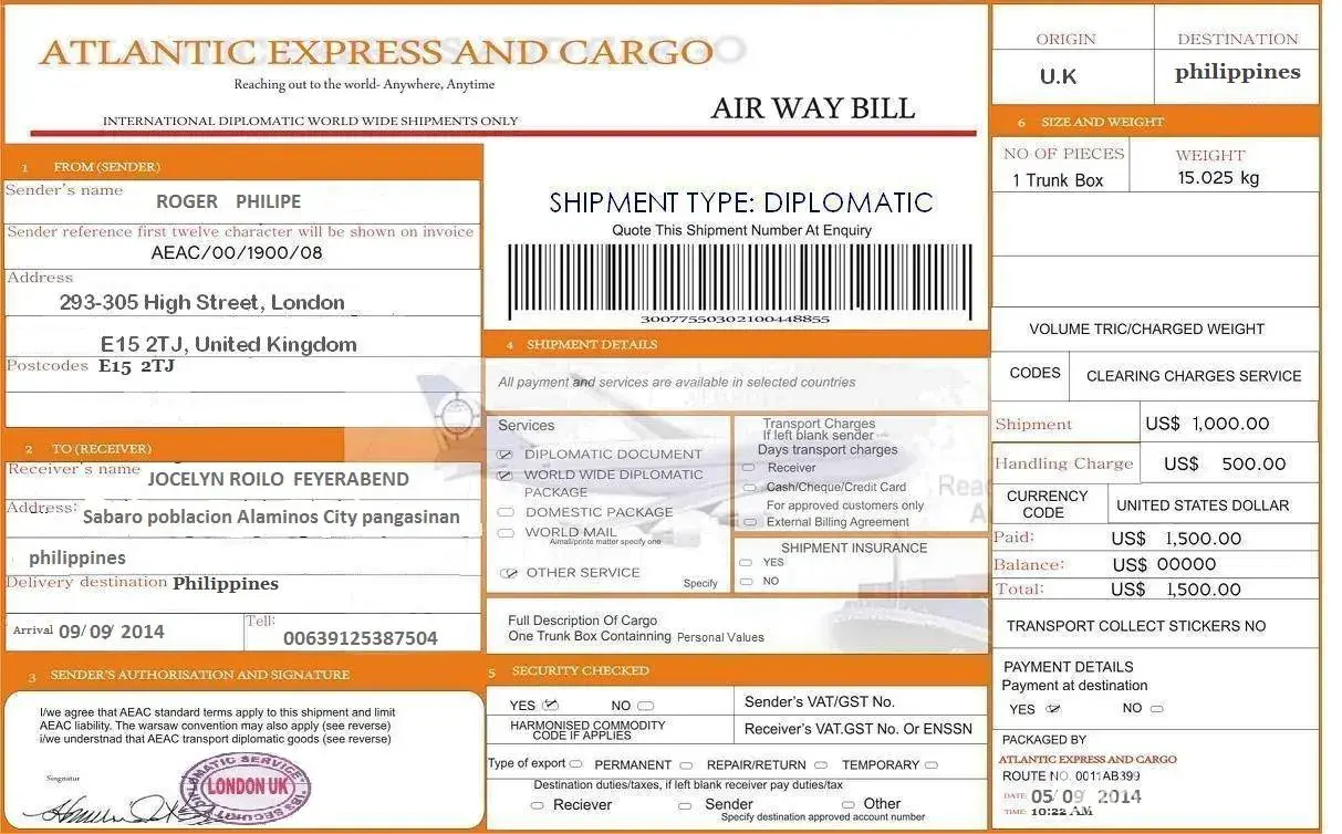 I have to complained something. i have a friend thru internet or social networking site who told me that he will send me a package contain of personal thing. i'm afraid it's some kind of a scam he called me early this morning around 8:00 a.m that the shipment will arrived today 09/09/2014 .. as i waited i print out the paper or a proof that he send me the a package which is 1 Trunk Box which is illustrated on the file. you can see the proof that i attached i hope you will give a feedback as soon as you read this ! i need to know it soon if it is true .. the name of the sender is Roger Philipe . then a while ago a pilipino netizen called me that the package arrived here in philippines but it can't be released if i wont pay a charge of 19 thousand peso. i'm not a rich person i cannot pay as big like that. im a government employee i worked as a reserved army but i dont have any salary ! and the one thing that makes me thinking why did the caller of this atlantic express and cargo from philippines knows what is inside the package ! please reply me !
