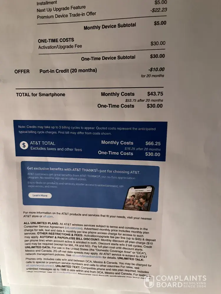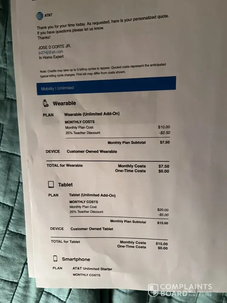 Salesman came to my house gave me written cost for new service. Lied. No one cares. Not customer service nor salesman nor chat nor ATT STORE. Now getting notice that my fam plan discounts ending. Did not have and only wit ATT LESS THAN a month. GOING TO DROP AND GO WITH T-MOBILE. BETTER price. Will pay off phone and much better customer service than ATT