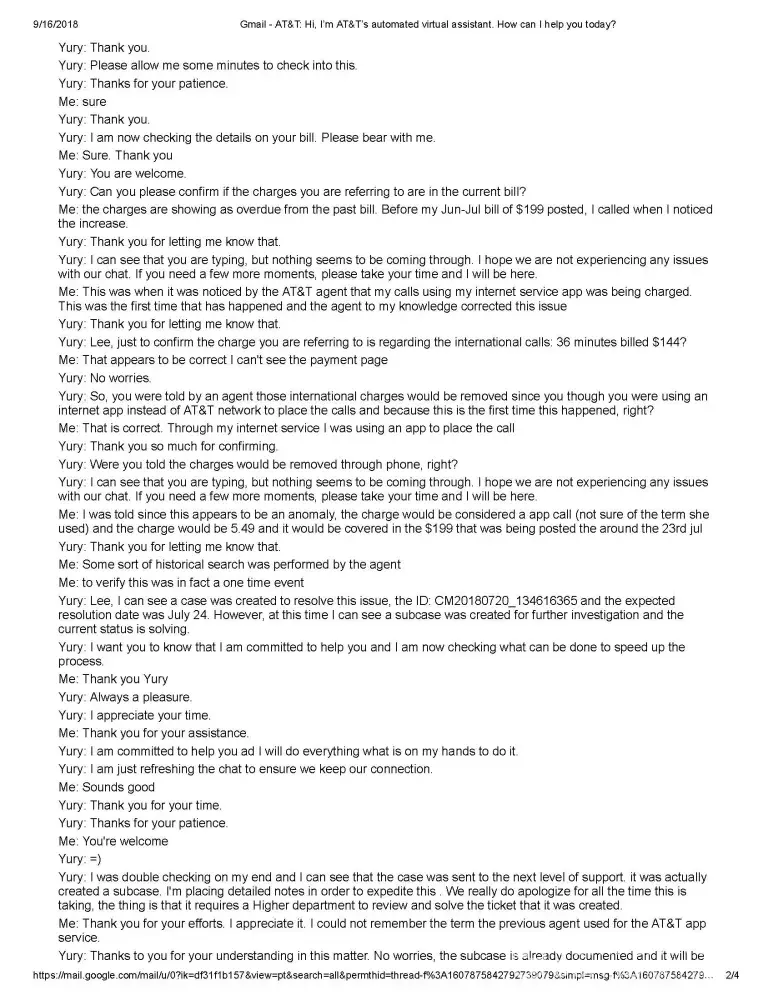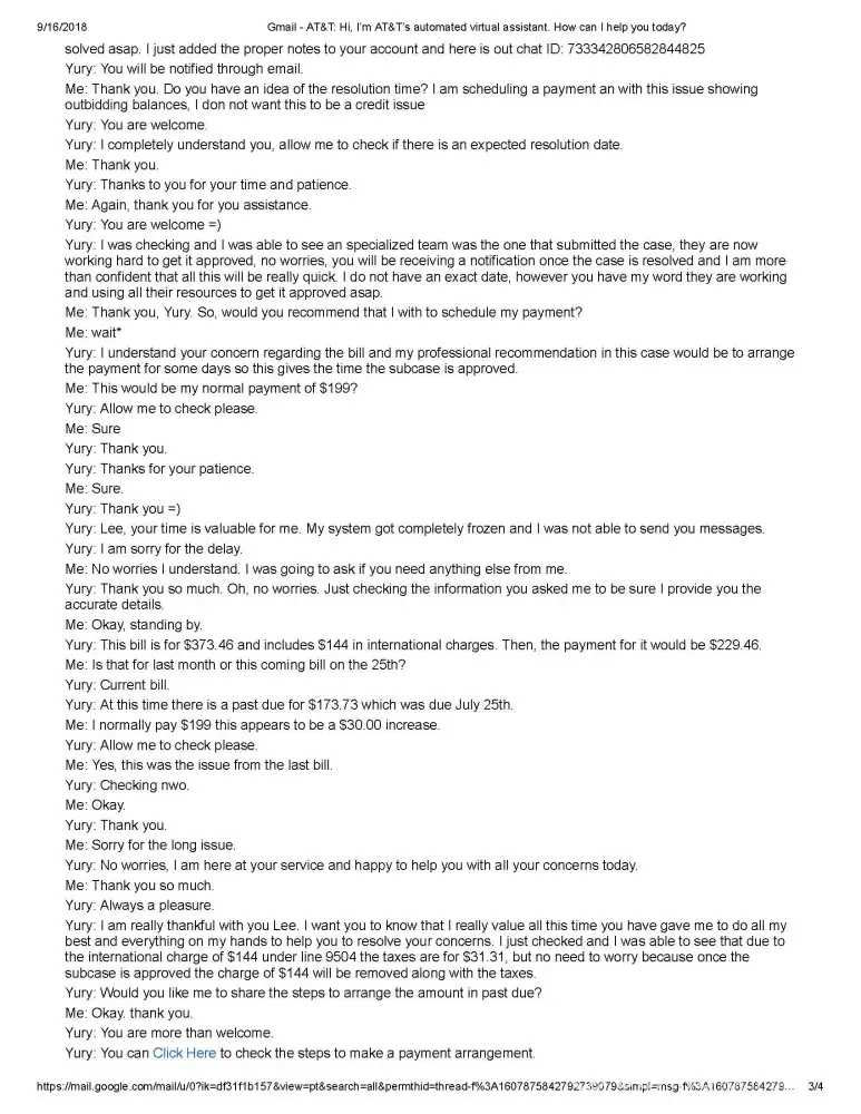 July's bill was paid minus the (errant amount) as I awaited resolution to overcharge issue. I placed a call in Late July with no resolution and again on August 4th where I was hung up on by an overseas ATT&T representative. I immediately began a chat session (attached) with Yury where I was assured this would be resolved and in good faith scheduled a payment 16 days out in order to cancel when the issue was resolved and schedule a normal payment. Following up August 11th on the status a week later, I called and was again disconnected and again established a chat session (attached) with AT&T representative Mary (overseas rep). I could not hear Mary at first because of the loud conversations and sports gaming (Like bets being placed) noise in her background. Eventually we were able to speak and I was informed first it was approved then it was declined and Mary excused herself and transferred me to her supervisor Aubrey which had the same loud background noise. Aubrey reviewed the history and noted that the request needed a higher level of approval and asked for a number to call me directly. I gave her my LAN line number but she was unable to get through so I gave her my AT&T cell number (redacted/deleted from text) and she responded that she could still not get through which was baffling. AT&T can't reach their provided AT&T number through their AT&T service? Aubrey then push the conversation over to the general customer service number which I called earlier and disconnected the chat.