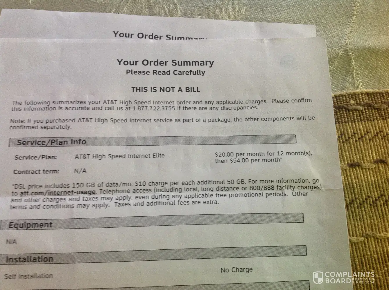 I've filed a complaint with Comsumer Class action and a collect agency to recover my money you keep charging me. I also want my bill reduced to $20.00 as shown on your document. Your order states the following "AT&T high speed internet elite...$20.00 per month for 12 month(s), then $54.00 per month". Your document doesn't state, list or show that the $20.00 is OFF $54.00.