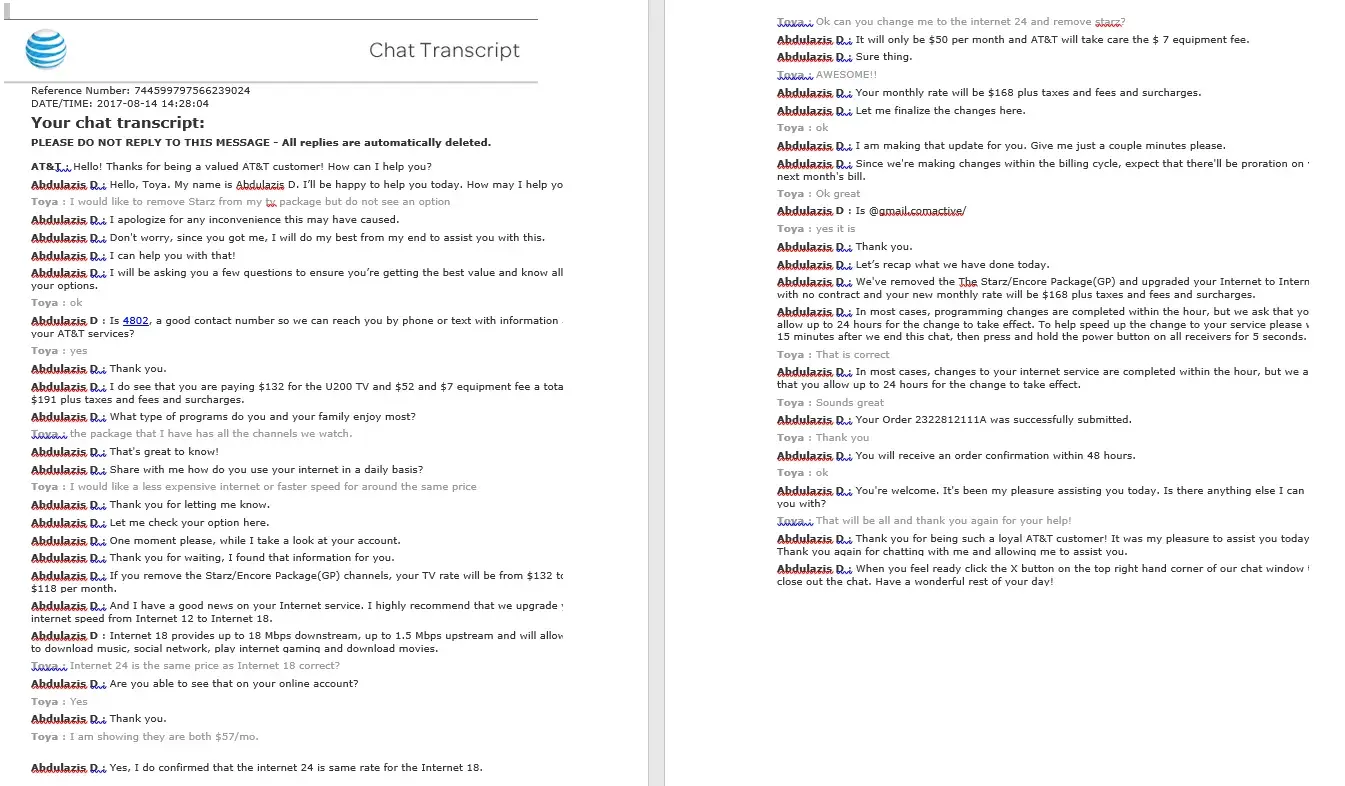 Service Cancelled after this chat conversation on 8/14: