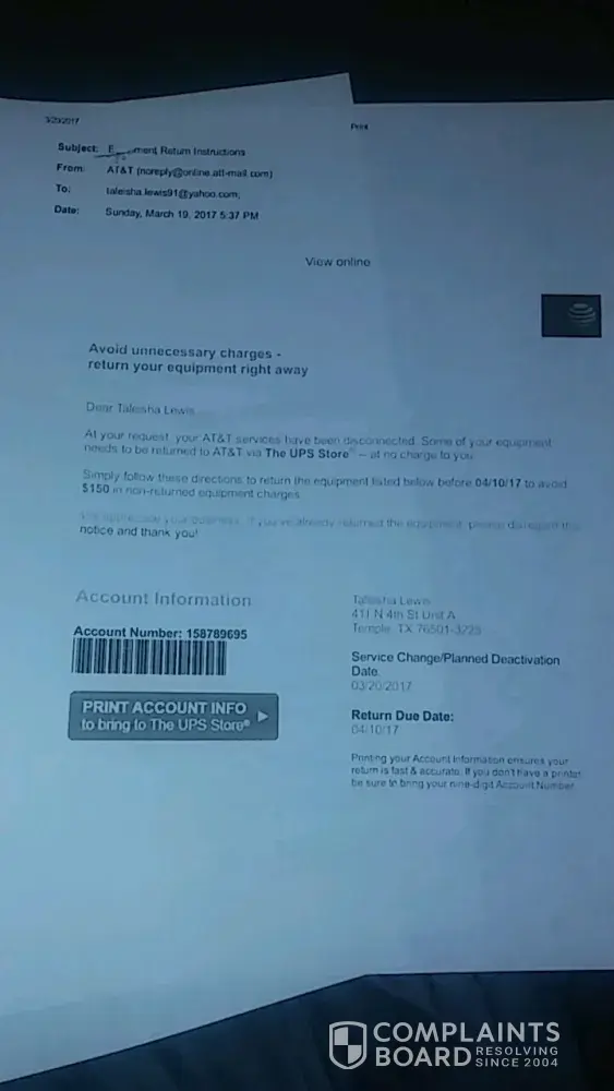 I was told numerous times on the phone and at the AT&T office where I walked the equipment in person to, that I was to ship it thru UPS and get a receipt stating return info. That once they received the equipment they would notify THE COLLECTION AGENCY and I would only pay the actual SERVICE BALANCE. I jumped thru hoops to get this stuff done.