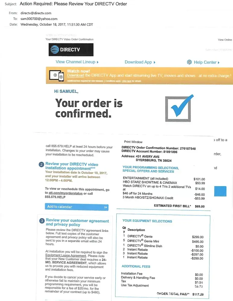 1 . instant Rebate $299.00 2. instant Rebate $100.00 3. instant Rebate $297.00 Bill for month was to be $117.29 . Is this the way Att is doing all there customers, the first bill wae to be $117.29 + $35.00 + $14.00 + Tax . Have been over charged on all Bills I have received . A copy of order is attached .