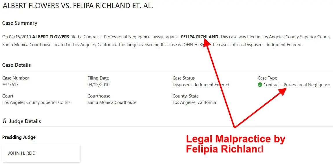 Former Beverly Hills attorney Felipa Richland was found to have lost numerous cases that resulted in a loss of many clients. Felipa Richland had to look for cheaper rent and went to Westlake Village in Ventura County. A few of the major losses include, but are not limited to, Nathan Enterprises Corp. v. Hyde Swigart, 2010 Cal. App. Unpub. LEXIS 7604...