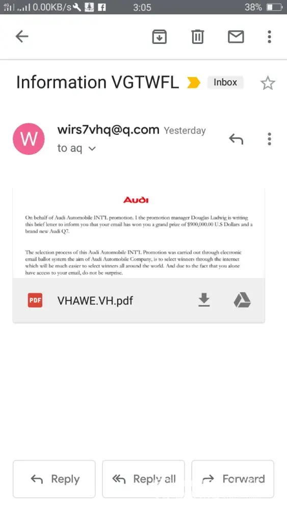 On behalf of Audi Automobile Company, I Mr. Don Morgan is writing this brief letter to inform you that your email has won you a grand prize of $900, 000.00 US Dollars and a brand new Audi Q7 2018 model.