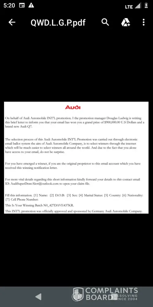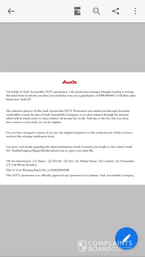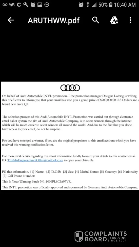 WOW -- what a bunch of greedy idiots who are wilfully giving up their personal information to a fake draw that you never entered in the first place. Do you REALLY think Audi would run a draw like this? And if they did, wouldn't they use a company email account instead of Outlook?