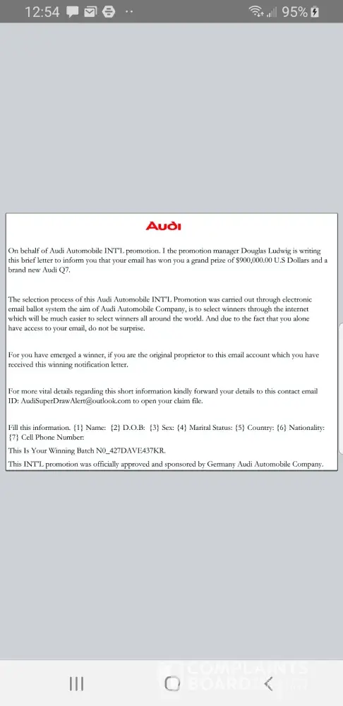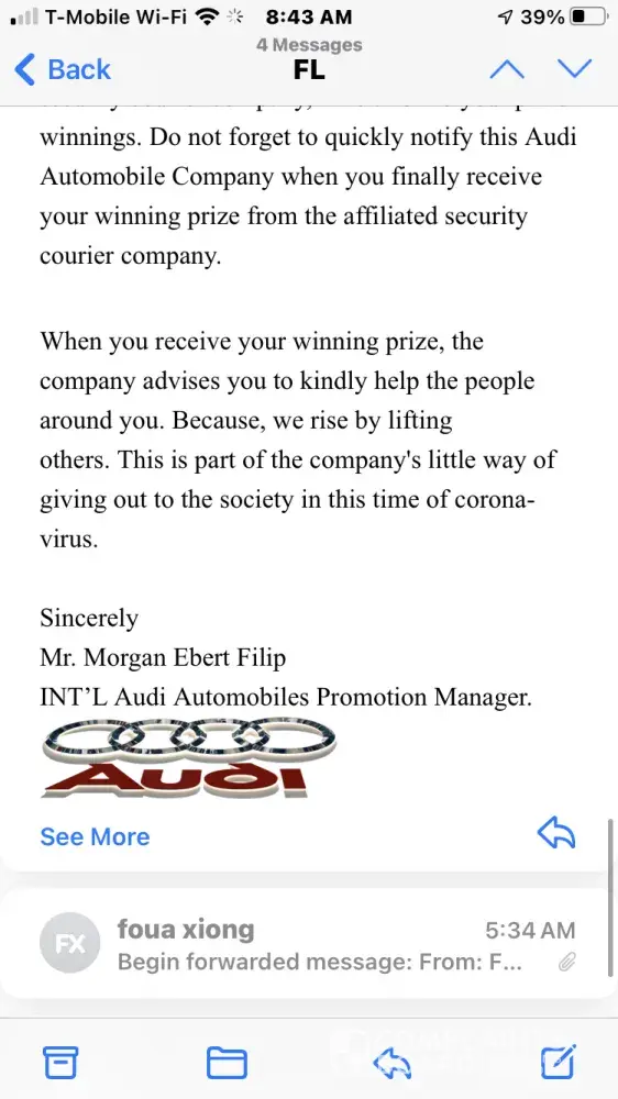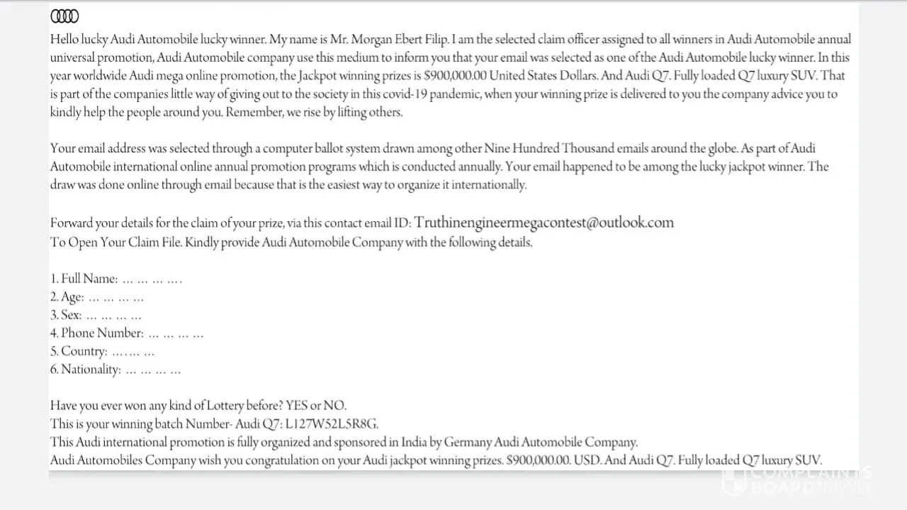 I just received an email about winning $900, 000 with an Audi 7 so they're sending that out again maybe you can write something on your website I received it on March 6 2021