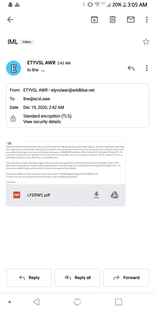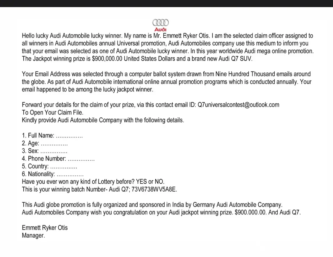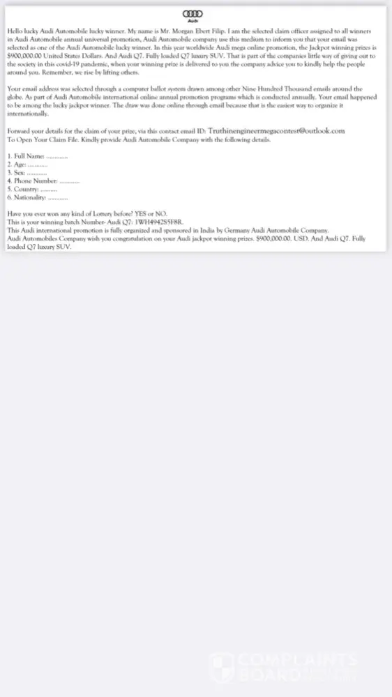I received a pdf file TOLMVCS from Mr. Morgan Ebert Filip stating that I am a lucky winner for Audi automobile lucky winner. It says my email was selected as one of the audi automobile lucky winner of the year worldwide Audi mega online promotion the jackpot winning prize is 900, 000.00 United States Dollars, and a Audi Q7, fully loaded Q7 luxury SUV.
