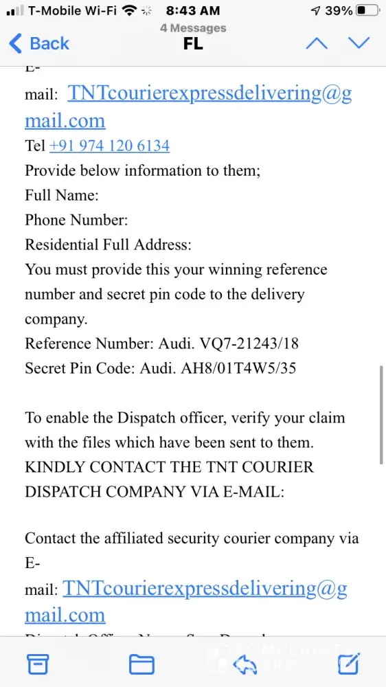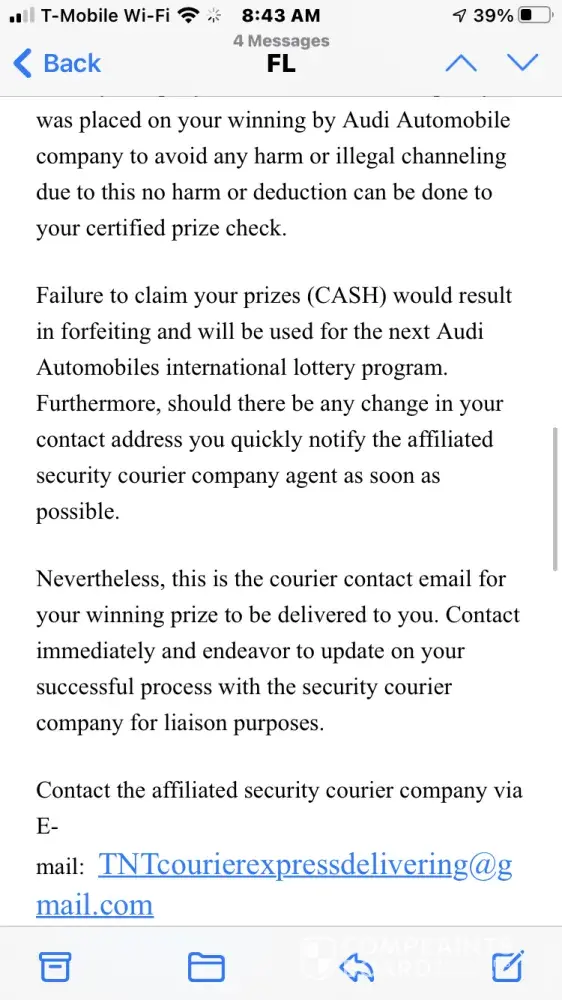 In furtherance to begin the claims process you are advised to contact the affiliated security courier company which will be responsible for the shipment of your check, upon that be also aware that before your winning prize was released to security company a hard cover insurance policy was placed on your winning by Audi Automobile company to avoid any harm or illegal channeling due to this no harm or deduction can be done to your certified prize check.
